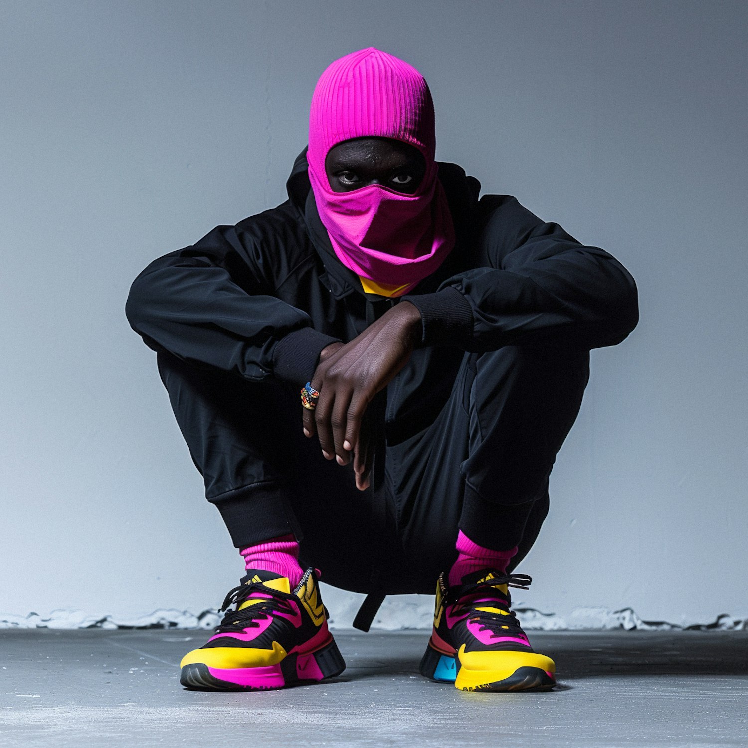 Person in a pink balaclava and colorful sneakers crouches in a black outfit against a gray background.