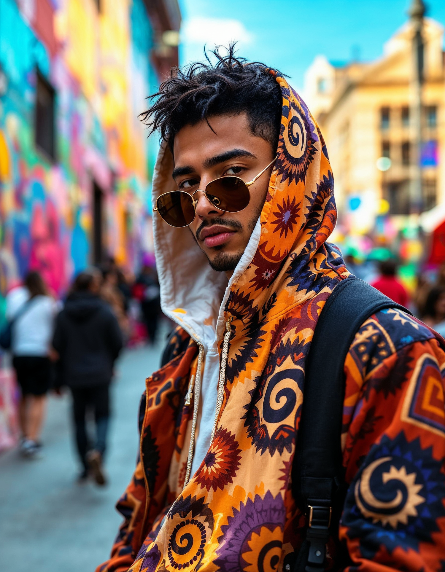 Stylish young man in vibrant hoodie and sunglasses in a colorful urban street setting.