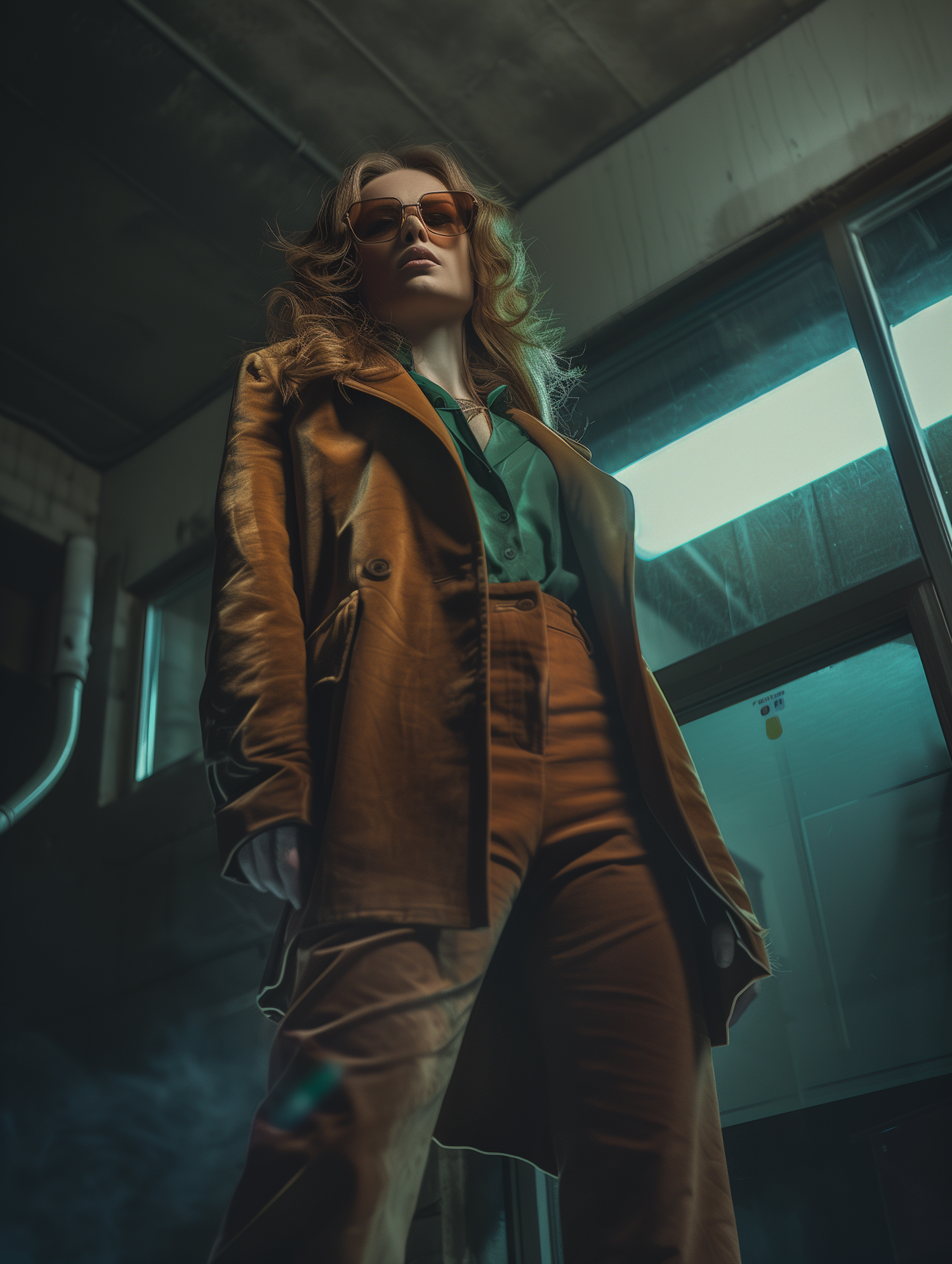 Stylish woman in trench coat and sunglasses, standing confidently in an industrial setting with dramatic lighting.