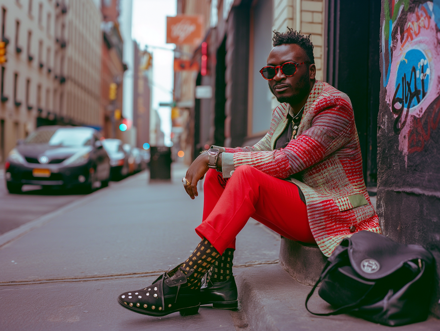 Stylish man in red and green jacket with red pants sits on city sidewalk, wearing red sunglasses and studded shoes.