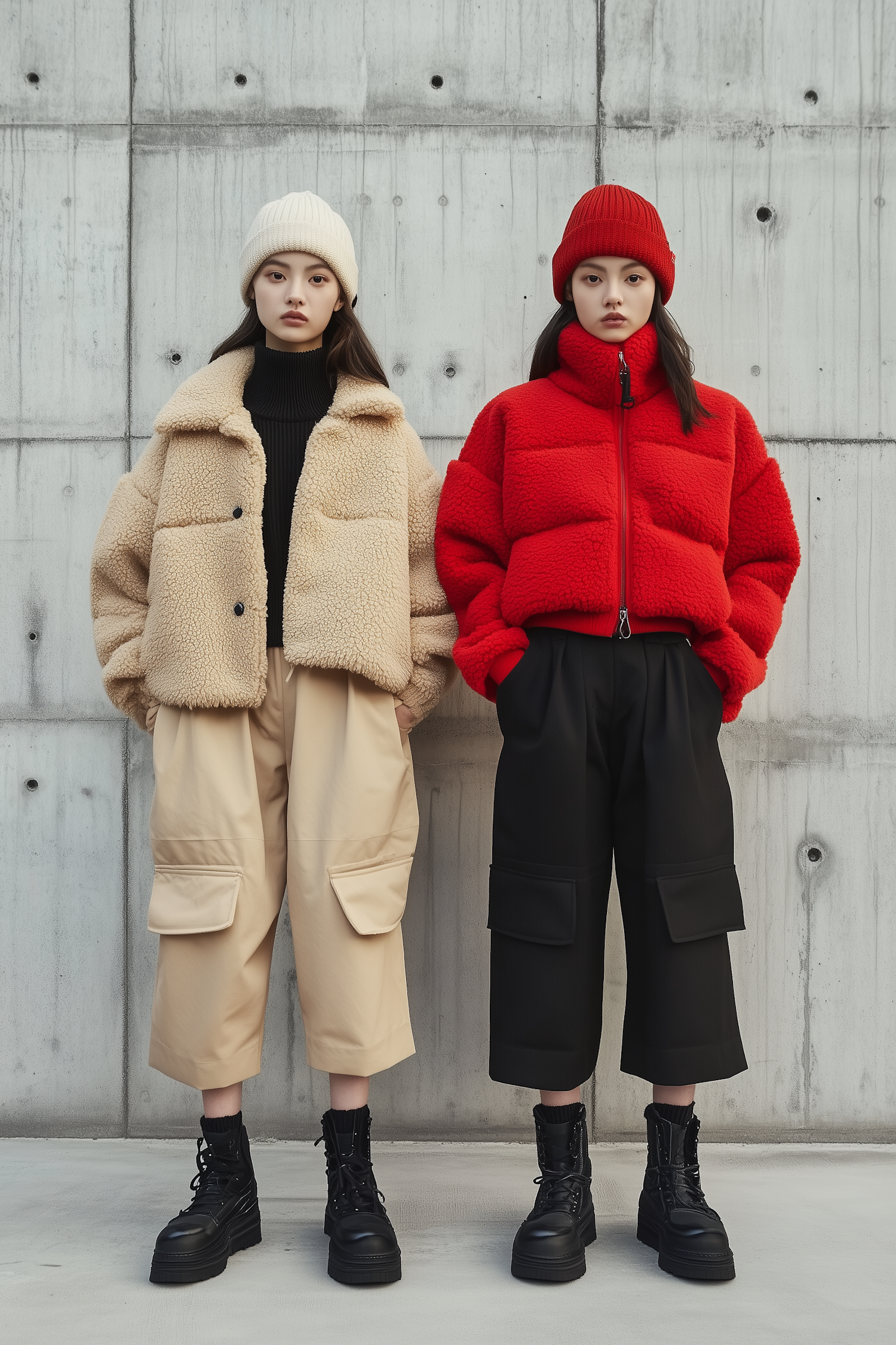 Two stylish women in contrasting fluffy jackets and beanies pose against a concrete wall, showcasing modern winter fashion.