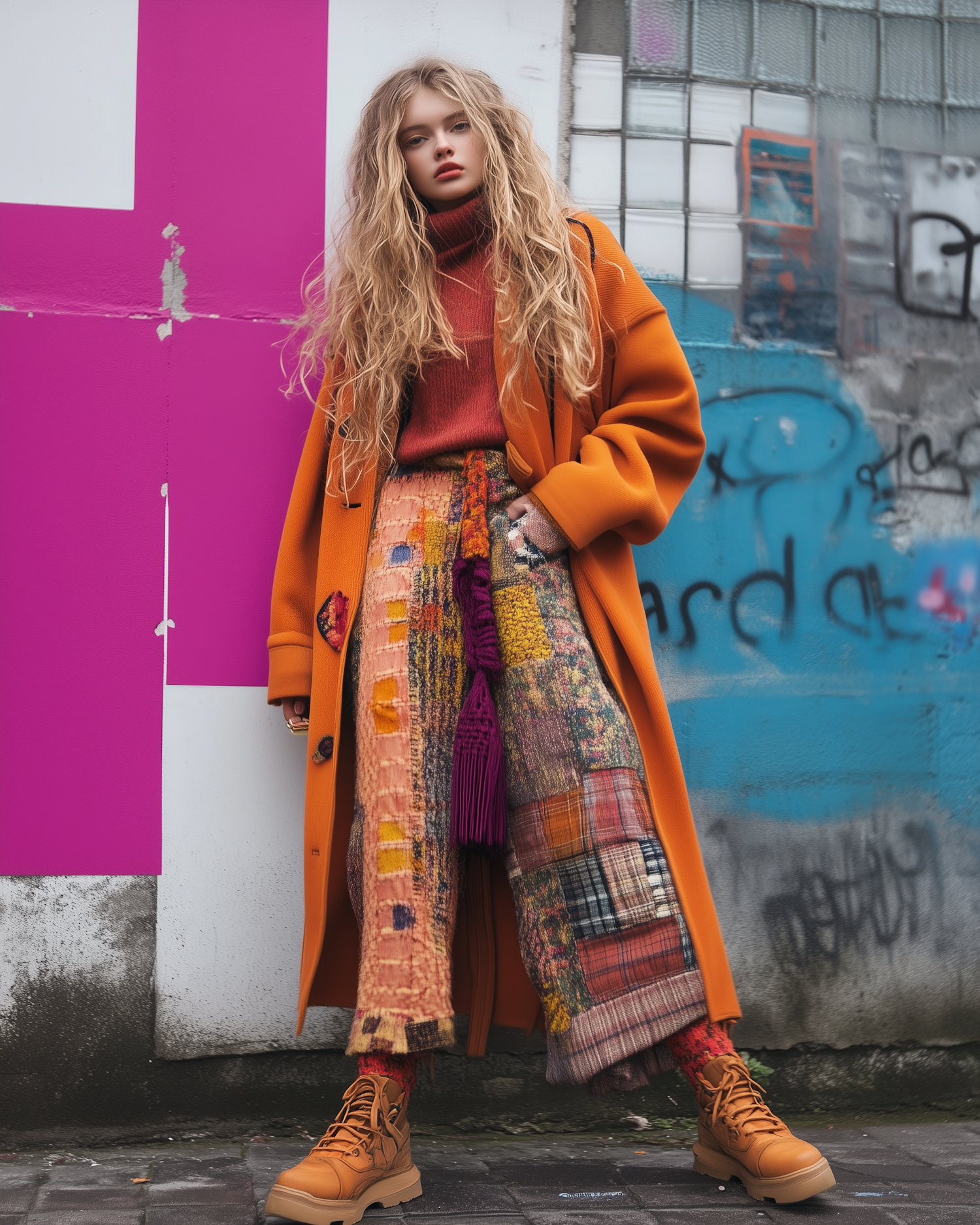 Stylish woman in orange coat and patchwork pants against vibrant graffiti wall, exuding confidence and modern fashion flair.