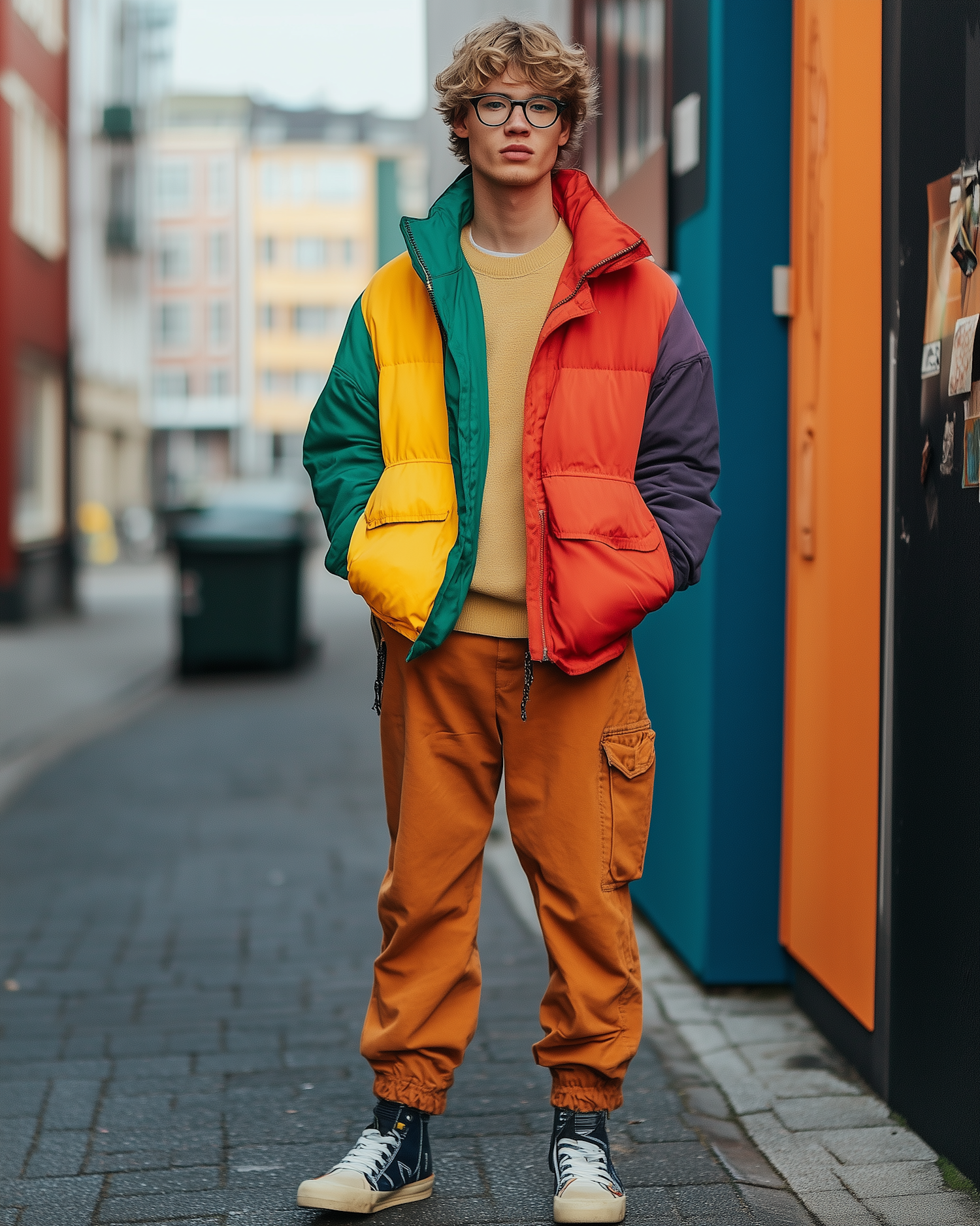 Young man in a colorful puffer jacket and cargo pants stands in a vibrant urban setting, exuding a trendy and confident style.