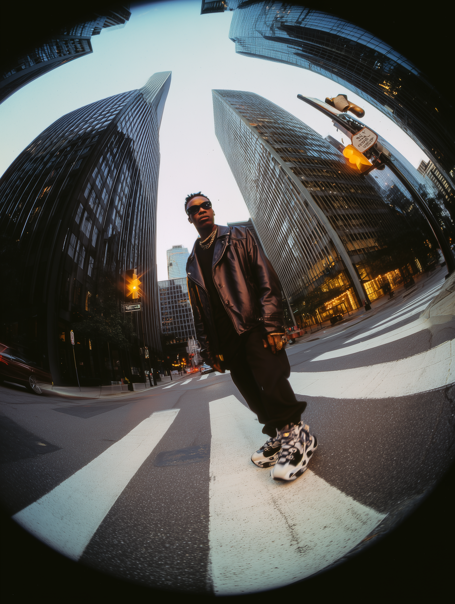 Stylish individual in a leather jacket and sneakers stands in a city crosswalk, surrounded by skyscrapers, captured with a fisheye lens.
