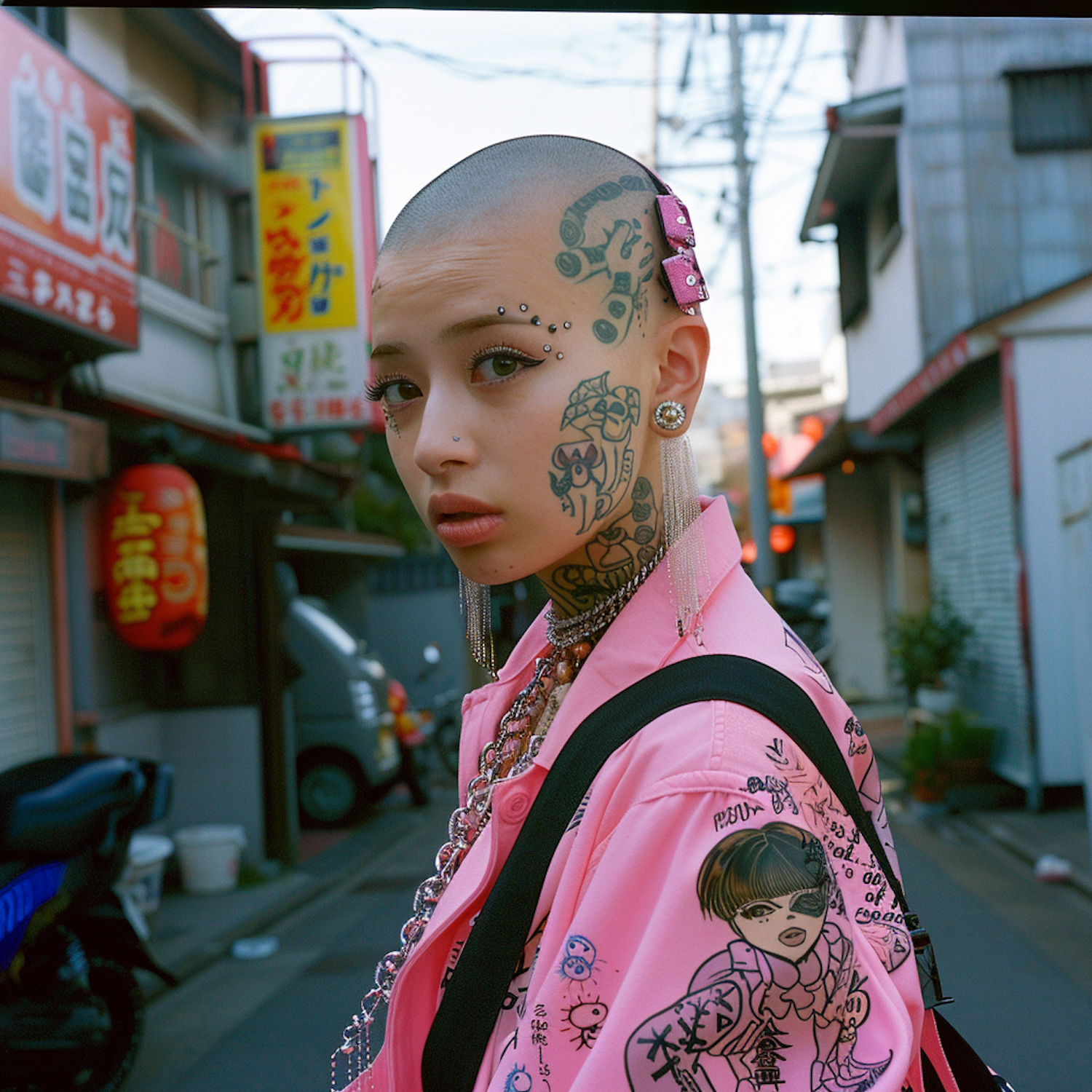 Bold street style with tattoos and piercings in an urban Japanese setting. Vibrant pink jacket adds flair to the edgy look.