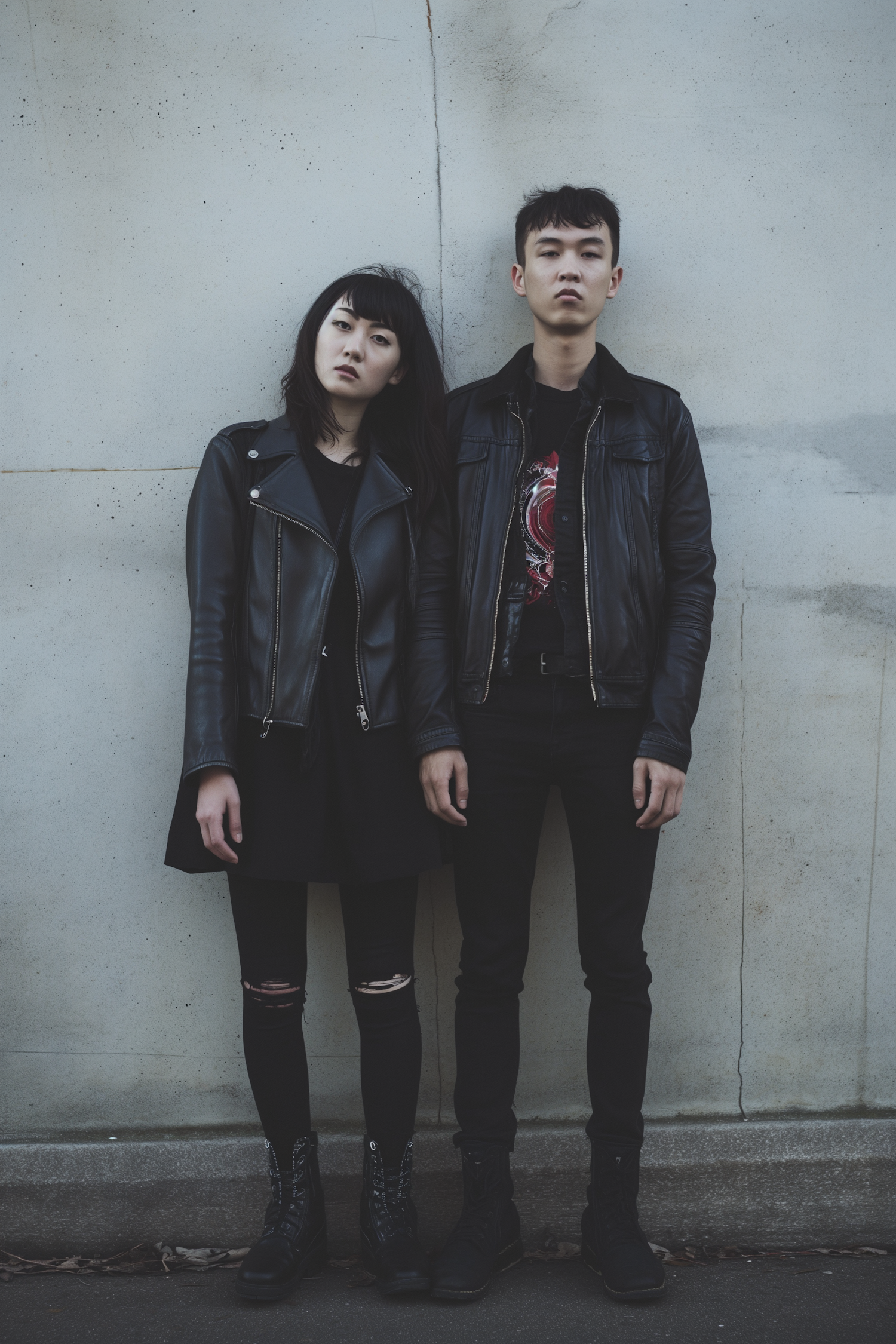 Two individuals in black leather jackets stand against a concrete wall, exuding an edgy, stylish vibe with monochromatic outfits.