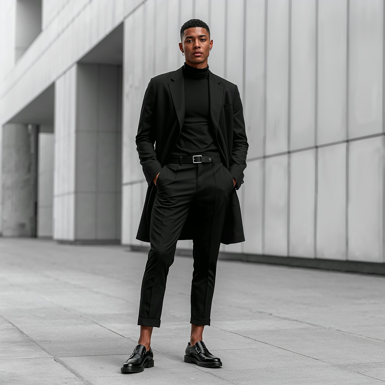 Stylish man in a black outfit standing confidently against a modern urban backdrop, showcasing sleek fashion and contemporary architecture.