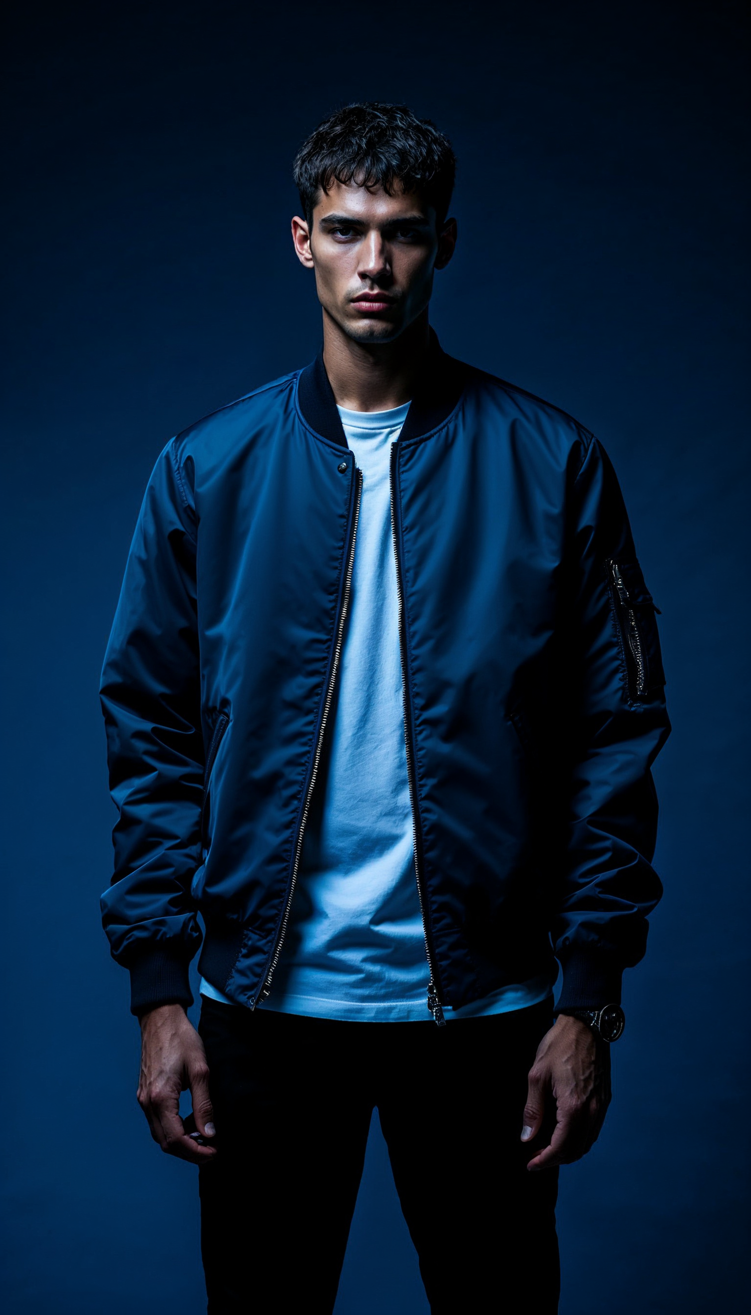 Stylish young man in a dark blue bomber jacket and white t-shirt, standing confidently against a dramatic blue background.