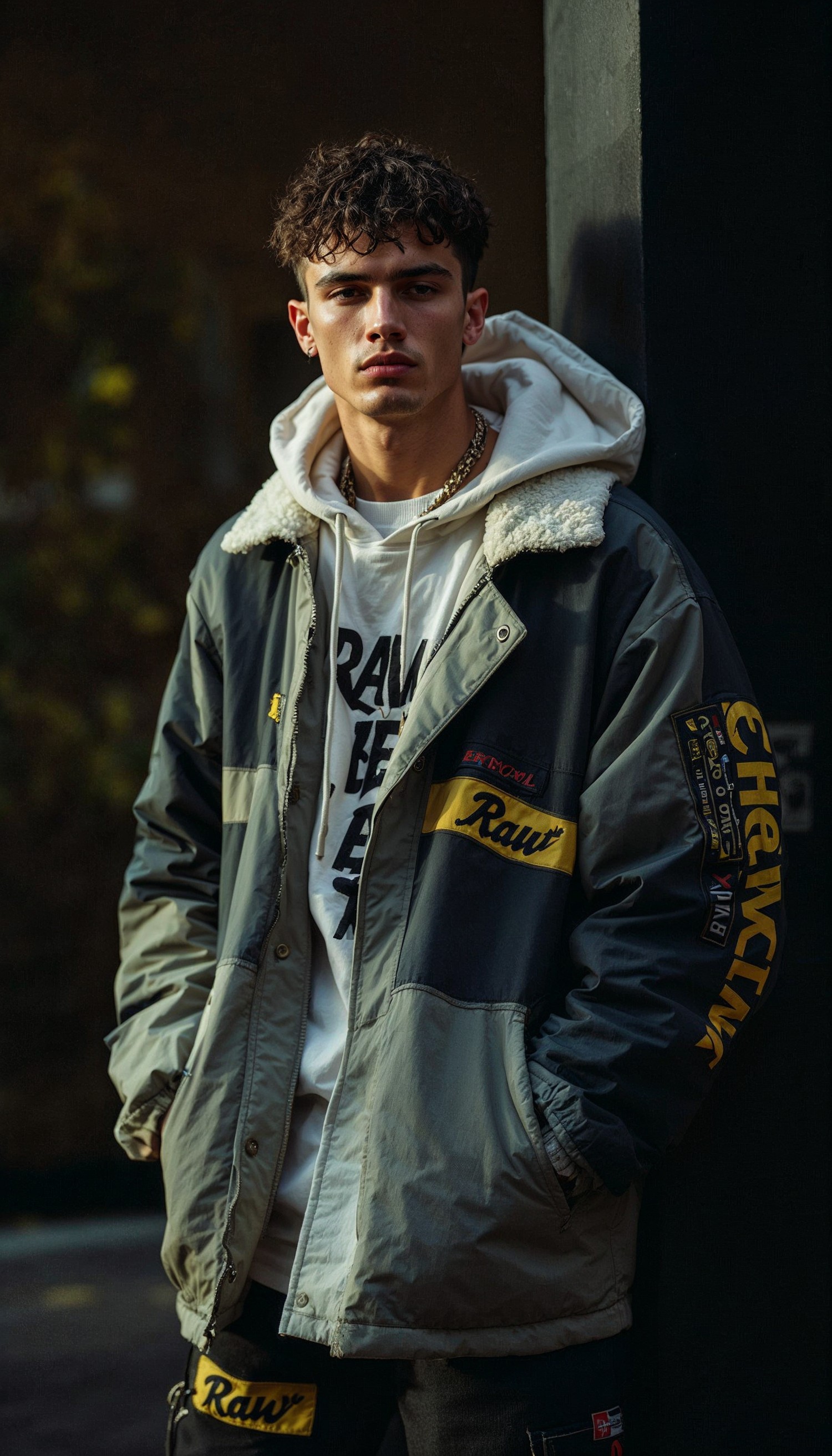 Young man in streetwear with a fur-lined jacket and hoodie, exuding urban style against a dark background.