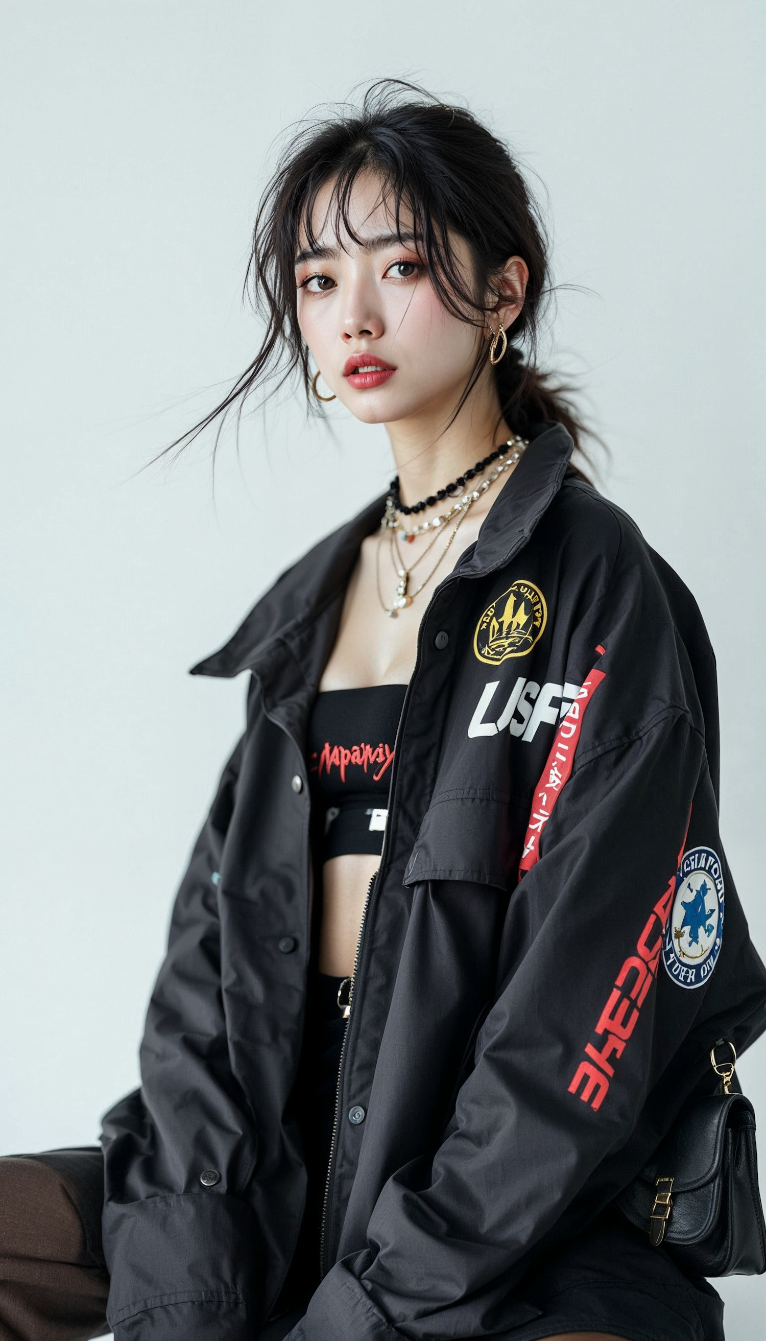 Stylish Asian woman in a black jacket with patches, wearing layered necklaces and hoop earrings, exuding confidence and elegance.