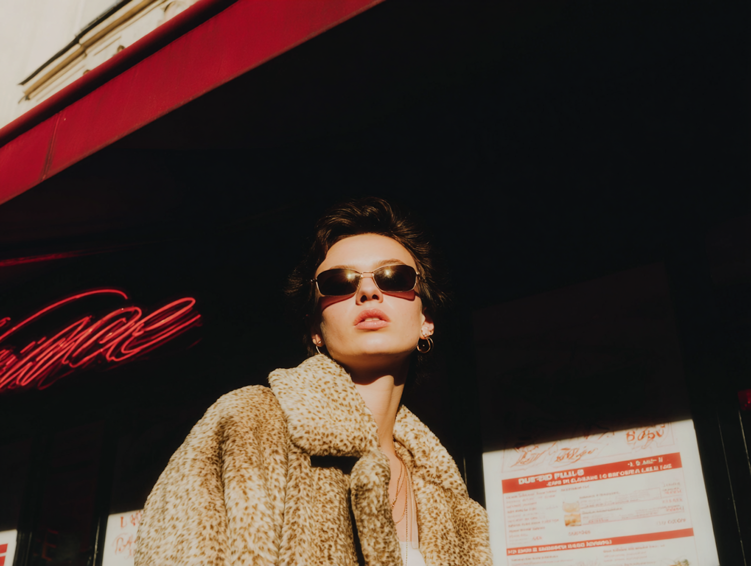 Stylish individual in a leopard-print coat and sunglasses, illuminated by dramatic lighting with a neon sign in the background.
