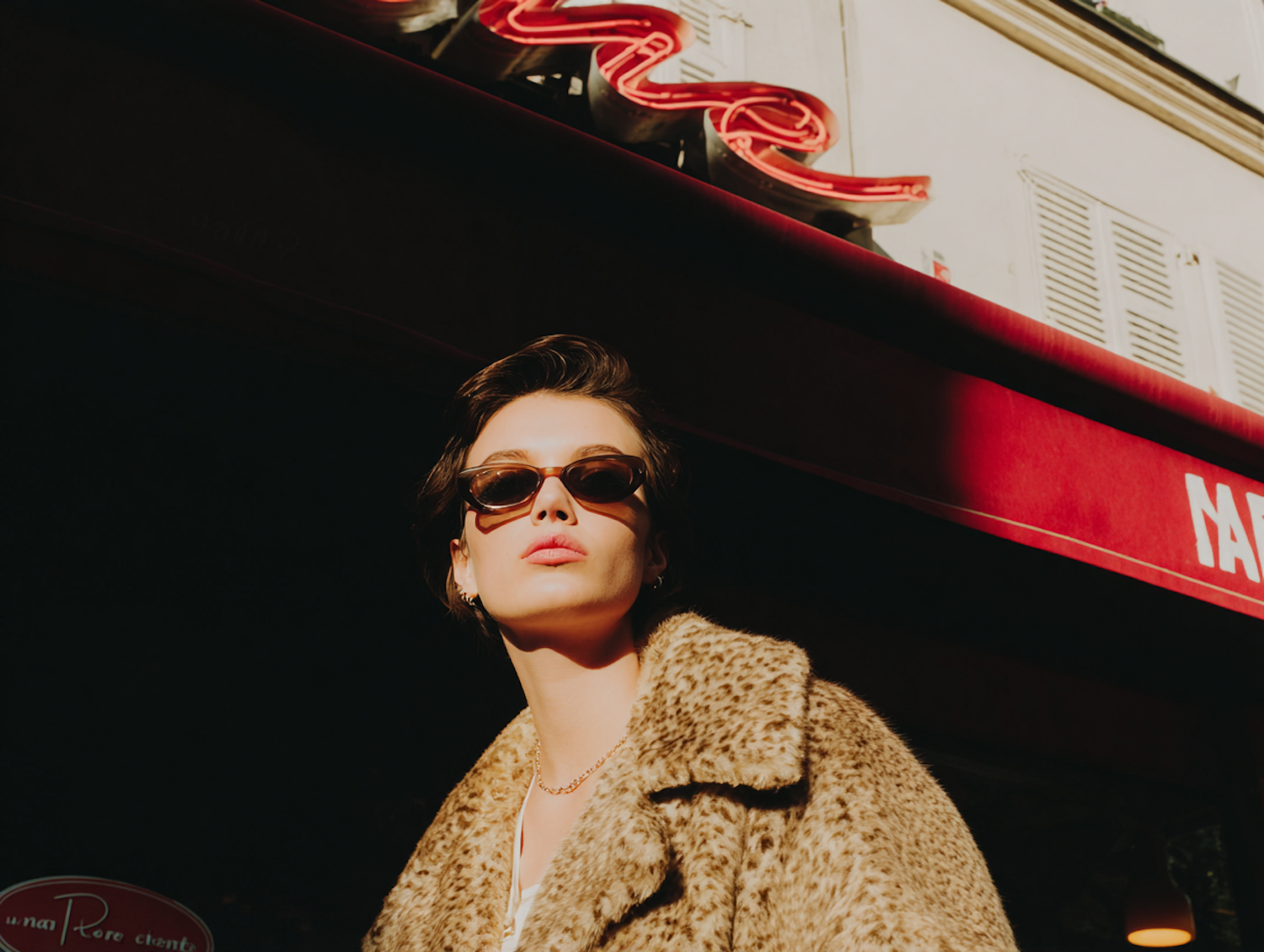 Stylish individual in a leopard-print coat and sunglasses, set against a city backdrop with dramatic lighting and a red awning.
