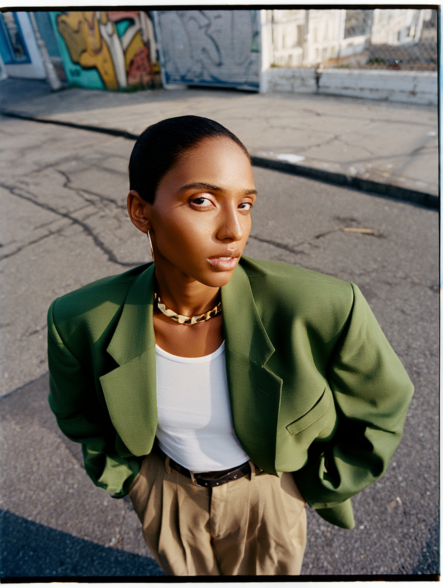 Stylish individual in a green blazer and gold necklace, posing confidently on an urban street with graffiti in the background.