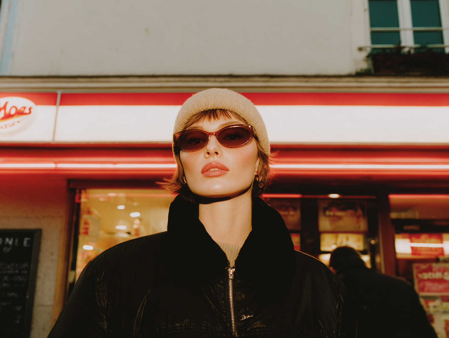 A fashionable person in a beanie and sunglasses stands in front of a brightly lit urban storefront, creating a chic and modern vibe.