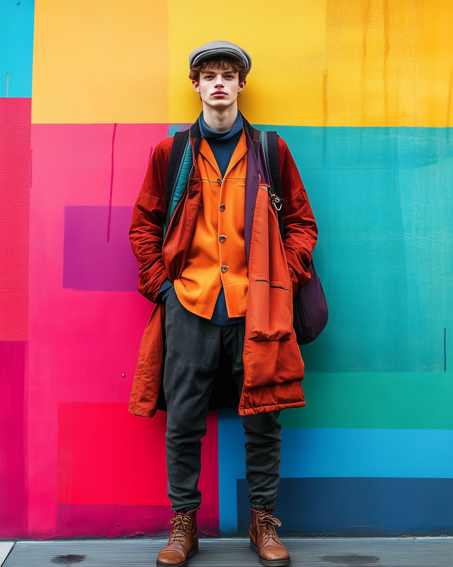 Young man in orange jacket and flat cap stands against a colorful wall, exuding urban style and confidence.
