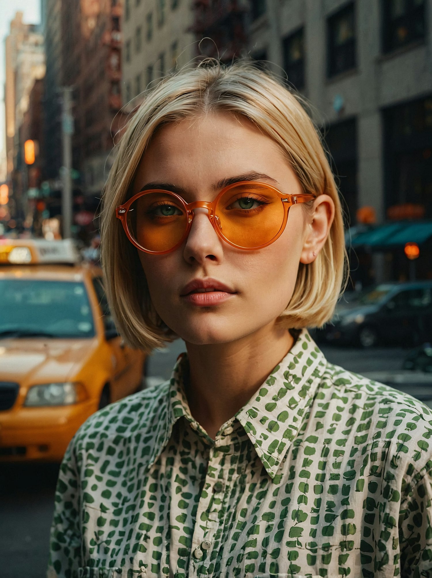 Stylish woman with orange sunglasses and patterned shirt in urban setting, yellow taxi in background.