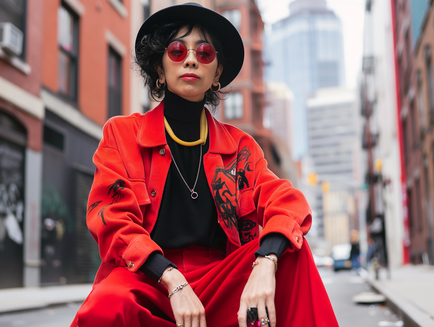 Stylish woman in red outfit with hat and sunglasses in urban setting, exuding confidence and flair.