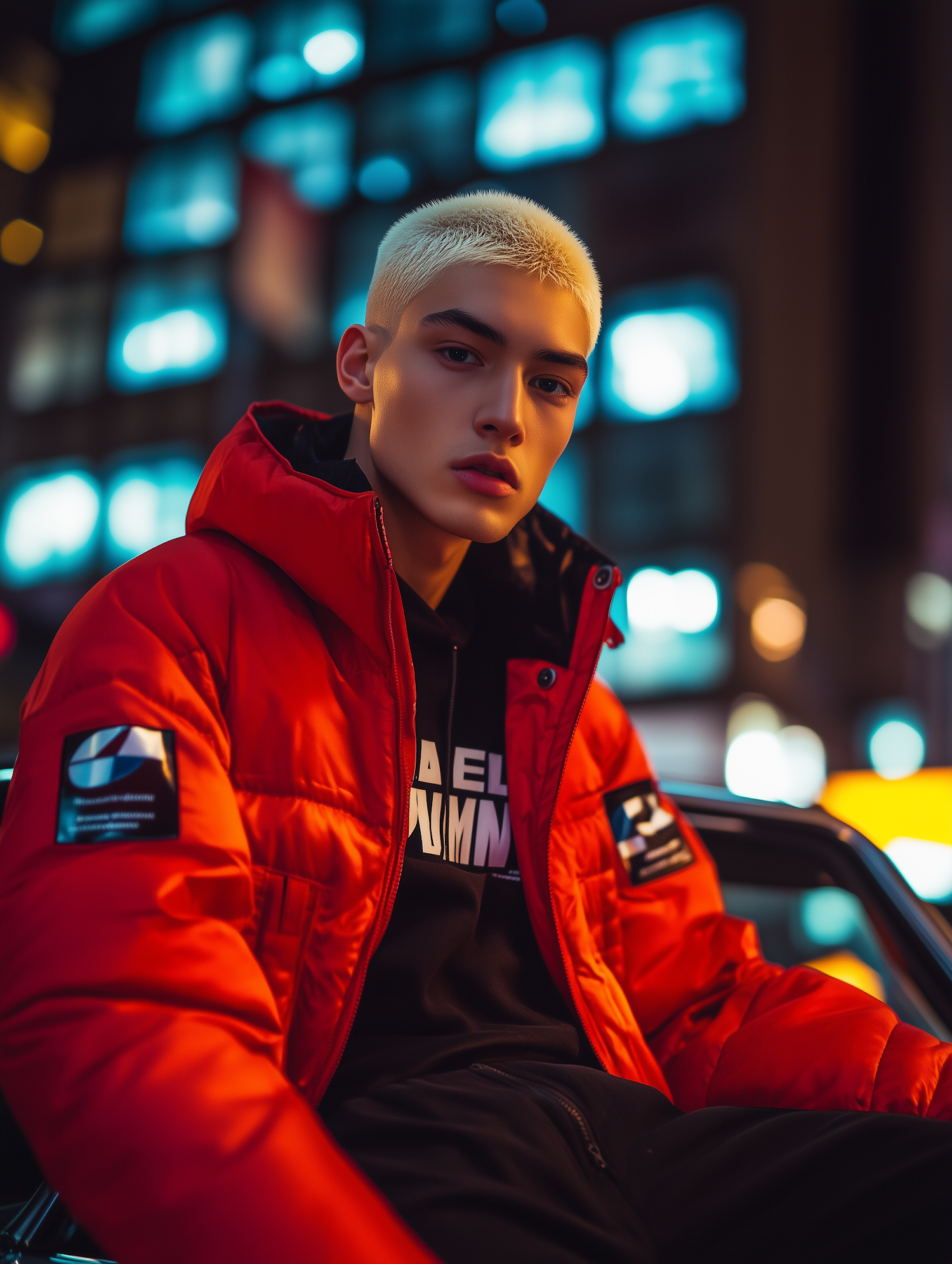 Young man in a red puffer jacket with platinum blonde hair, set against a vibrant city nightscape with colorful lights.