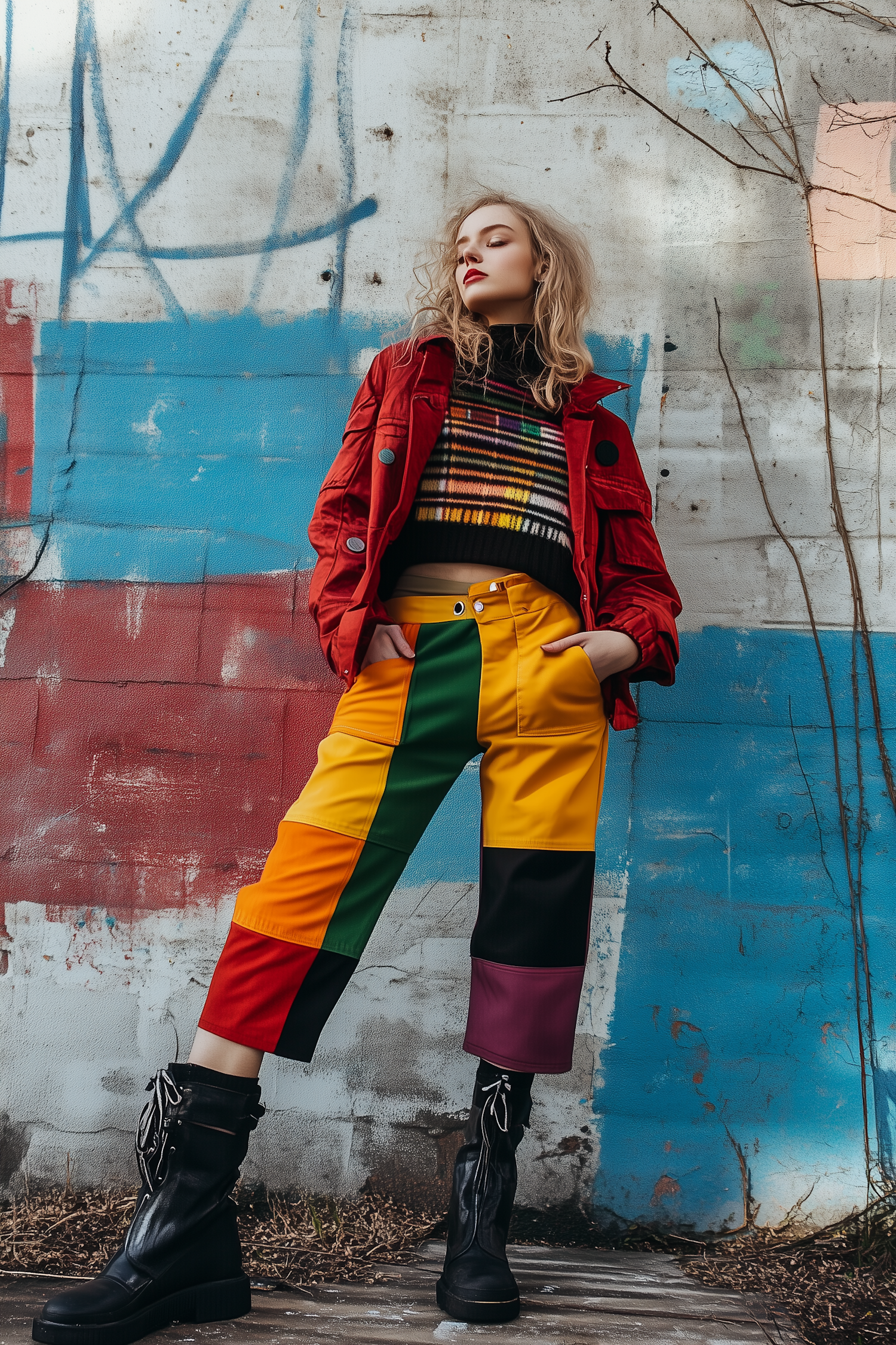 Fashionable woman in colorful outfit poses against graffiti wall, showcasing bold style with red jacket, patchwork pants, and black boots.