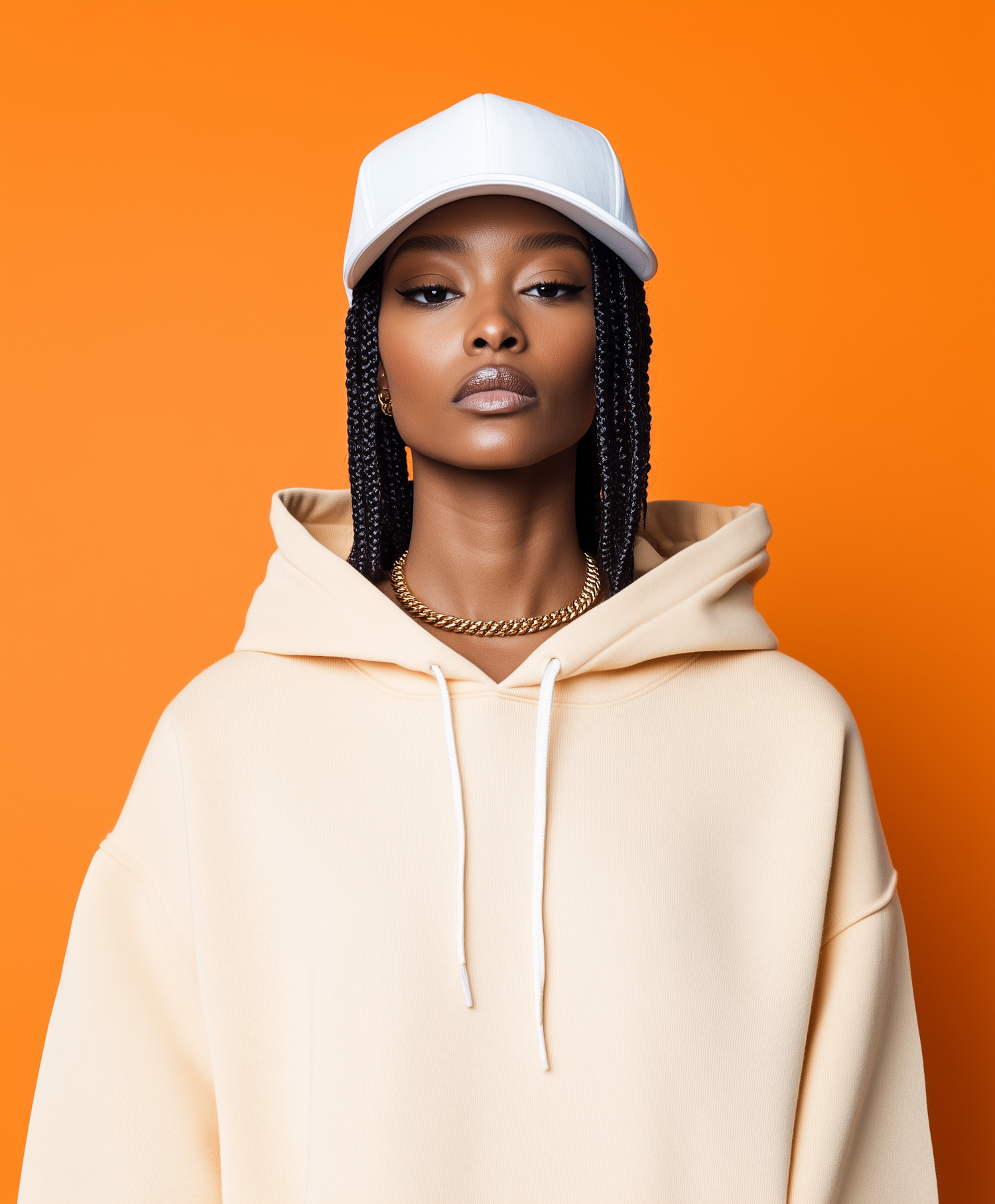 Stylish woman in a beige hoodie and white cap against a vibrant orange background, exuding confidence and elegance.
