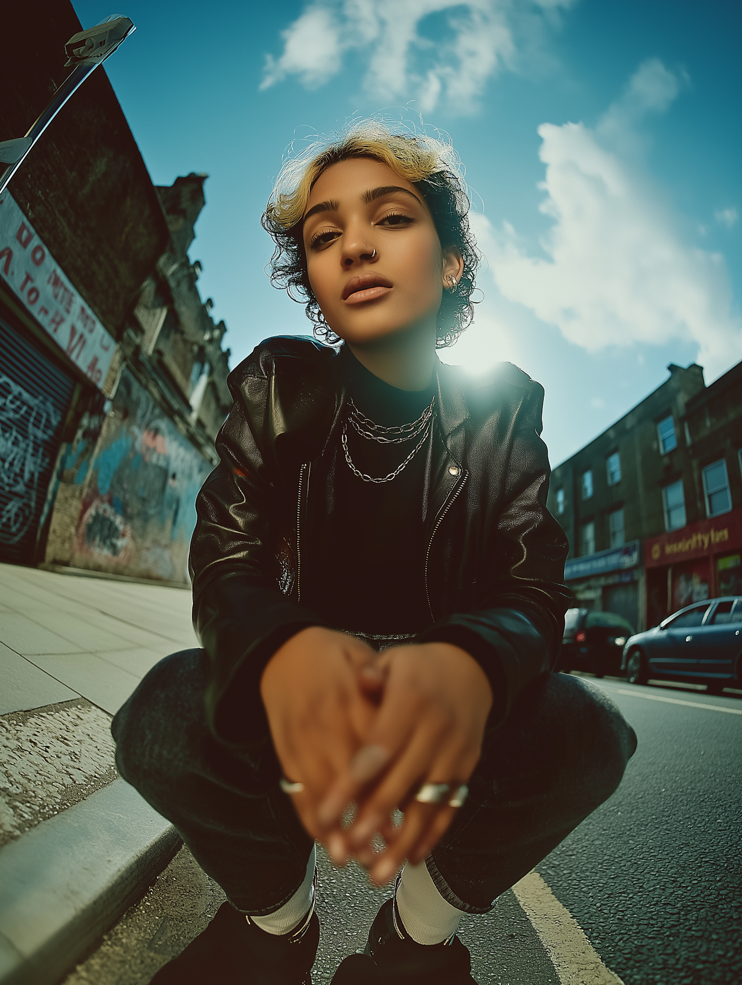 Urban setting portrait of a stylish individual, crouched low in a black leather jacket, radiating confidence under a vivid blue sky.