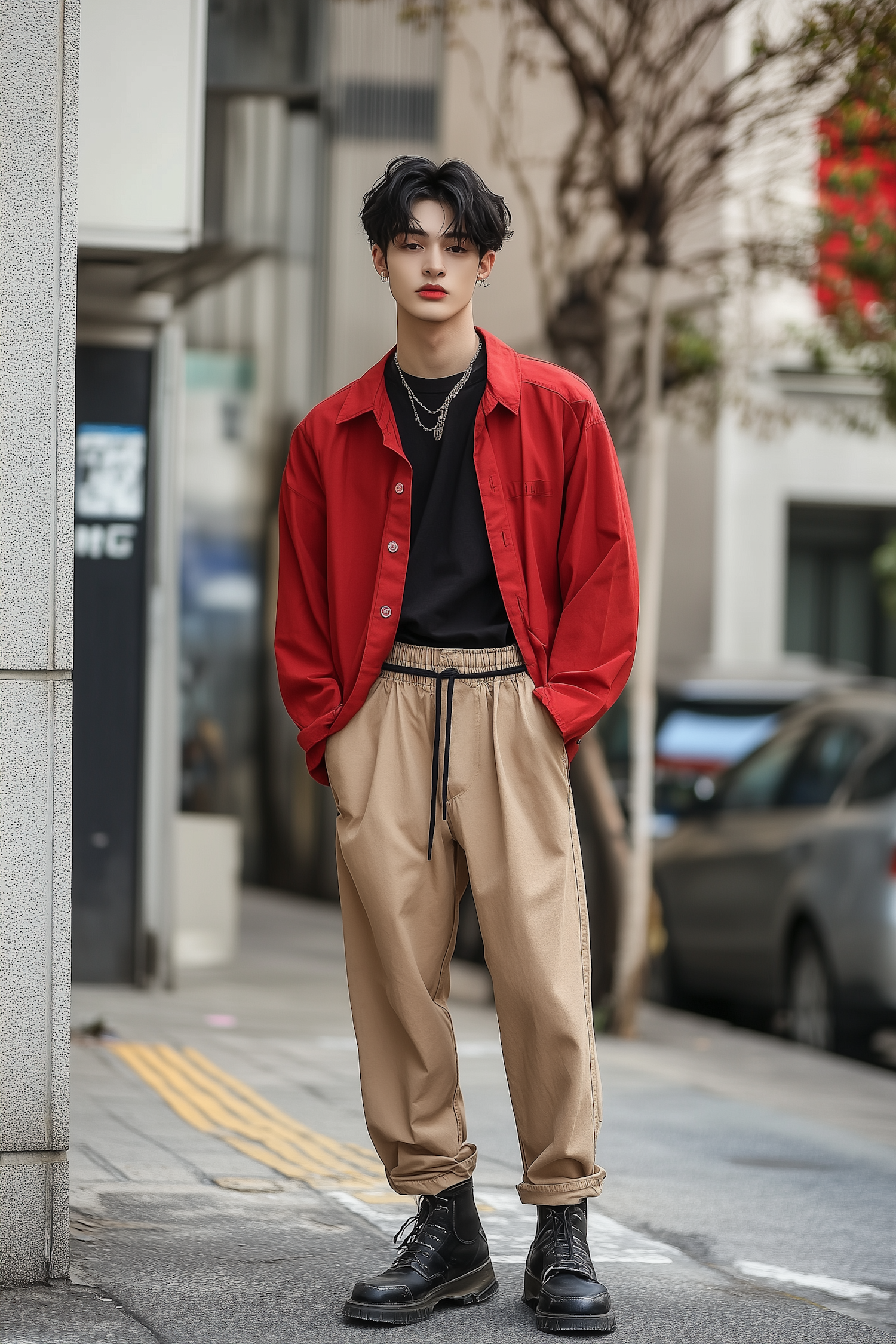 Stylish Asian male in red shirt and beige pants, standing confidently on a city street. Urban fashion with black boots.