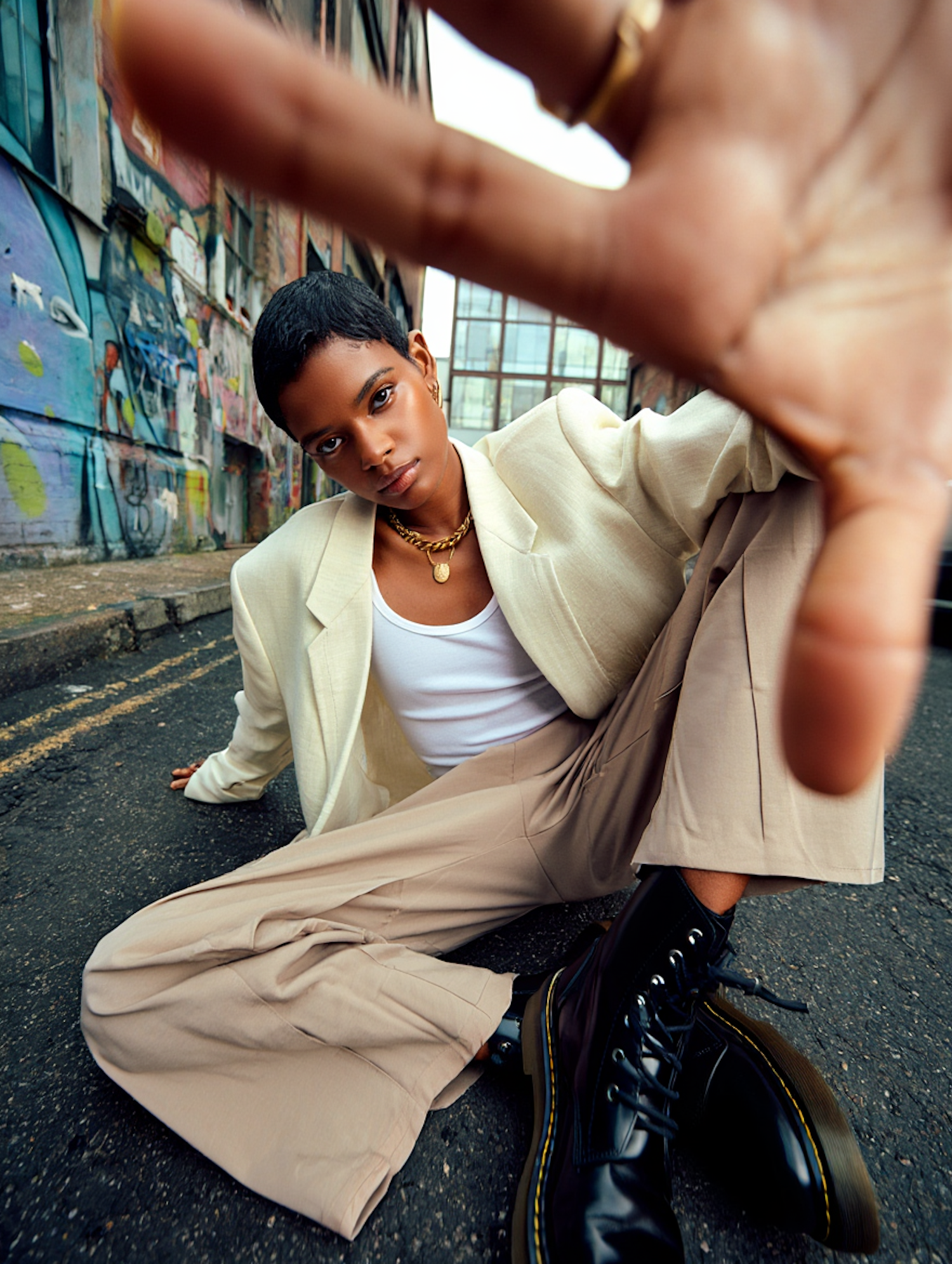 Stylish sitter wearing a beige outfit strikes a captivating pose against urban graffiti and industrial backdrops, radiating personality.