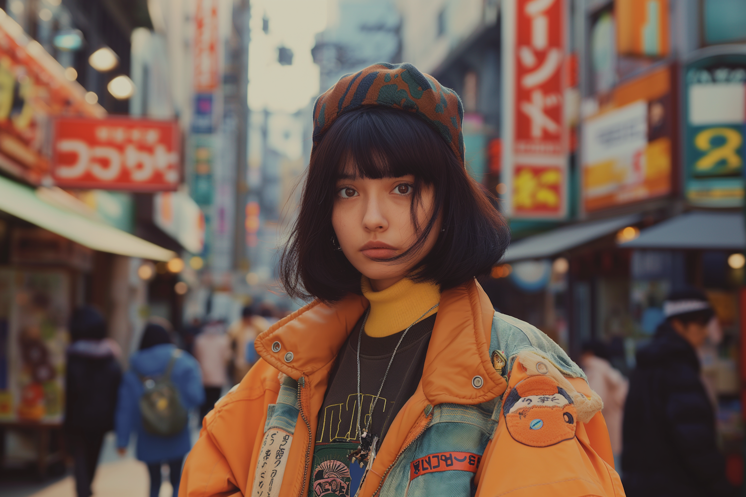 Stylish young woman in an orange jacket and camo beret stands in a vibrant city street with colorful signs and bustling activity.