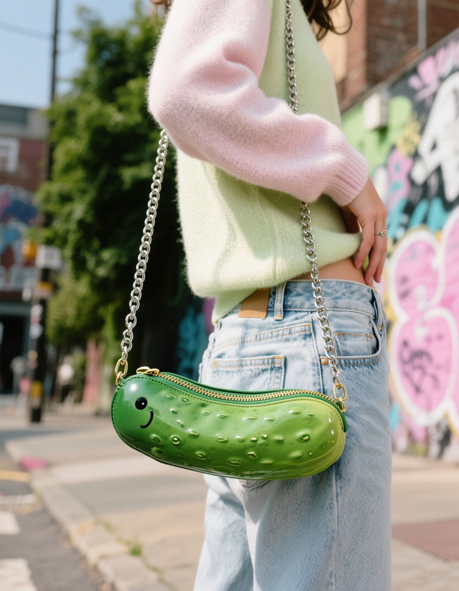A playful pickle-shaped handbag with a smiling face, paired with a pastel sweater and jeans, in a vibrant urban graffiti setting.