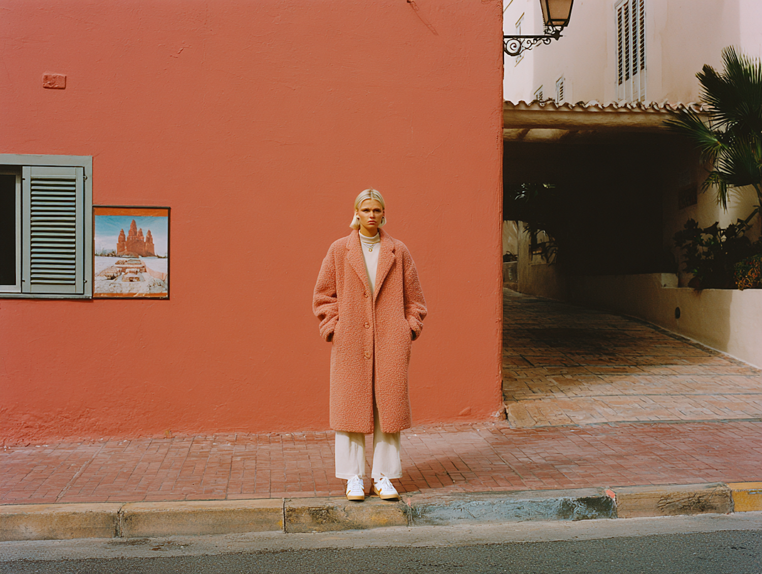 A person in a pink coat stands by a coral wall with a window and framed art, creating a stylish urban scene.