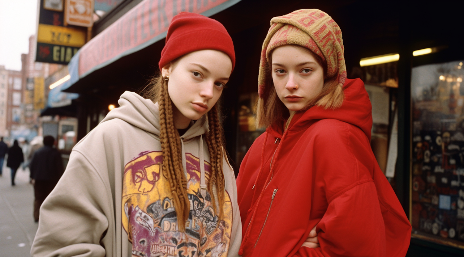 Two stylish young women in urban streetwear pose confidently on a city street, showcasing bold hoodies and headwear.