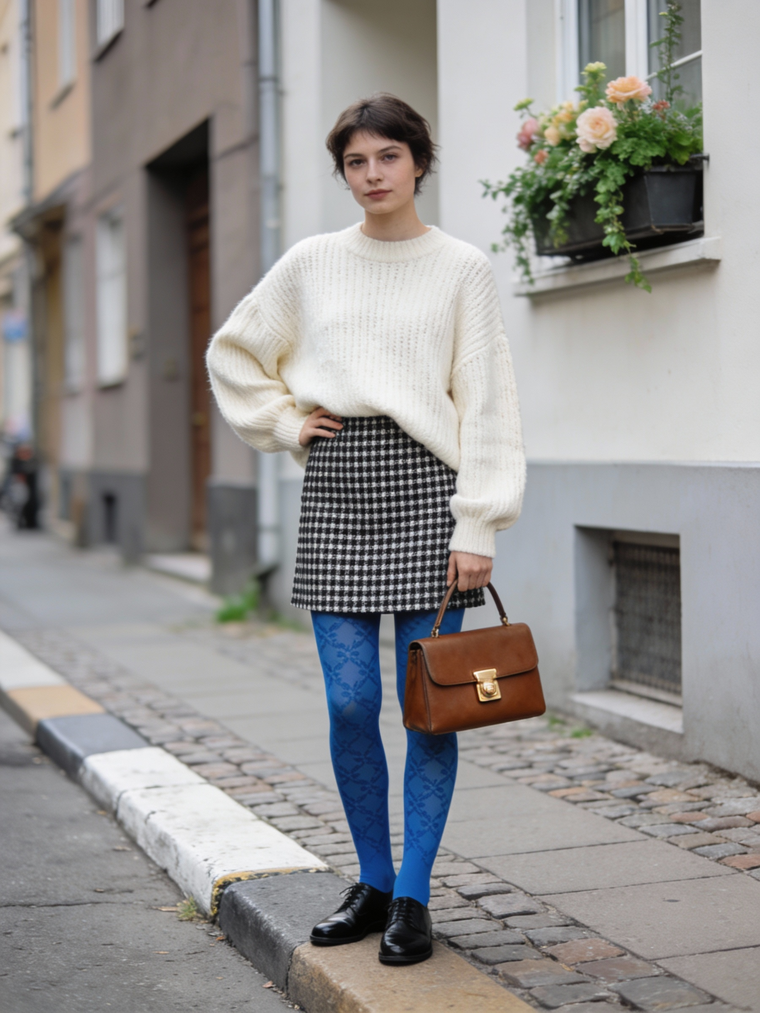 A stylish individual stands on a cobblestone sidewalk They wear a loose cream-colored sweater paired with a black and white checkered skirt, blue patterned tights, and black shoes. A structured brown handbag with a gold clasp is held in one hand. The setting is urban and residential, with a flower box visible in the background. The lighting is soft and natural, casting gentle shadows that highlight the textures of the knitwear, the patterned tights, and the architectural details. The composition is editorial and eclectic, blending cozy fashion with Scandinavian-inspired minimalism through muted tones and clean framing.