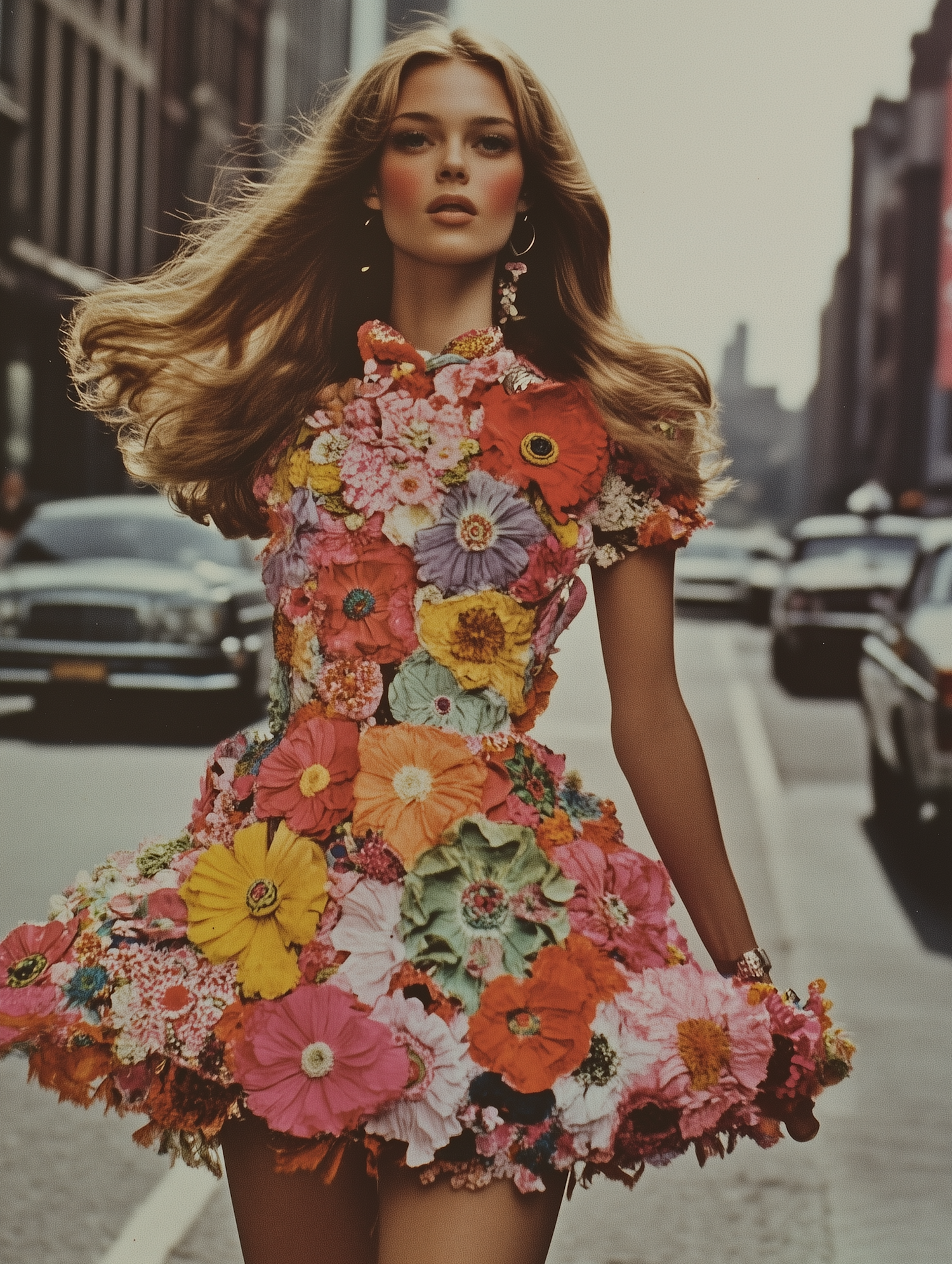 A stylish woman in a floral dress walks confidently in an urban setting, blending vibrant fashion with a dynamic city backdrop.