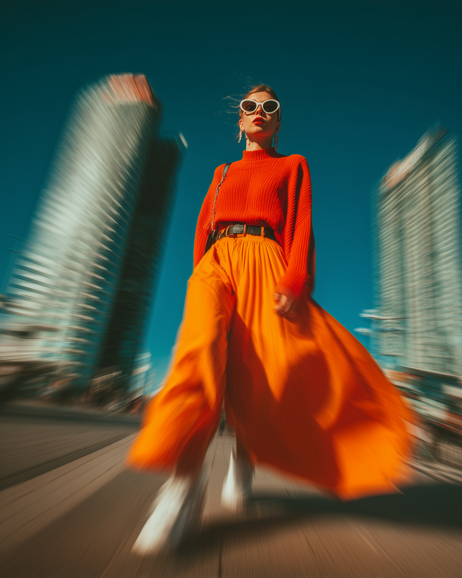 A fashionable person in a vibrant orange outfit walks confidently in an urban setting, with blurred skyscrapers in the background.