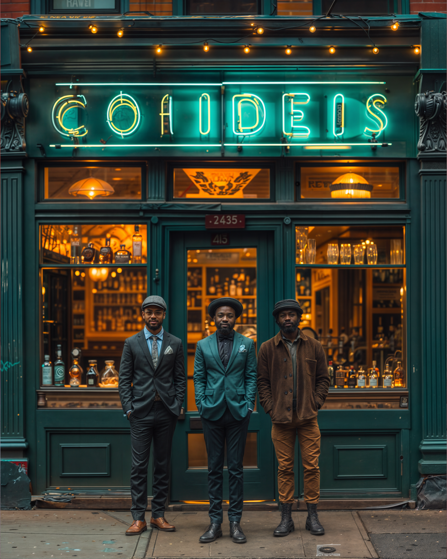 Three stylish men pose in front of a chic coffee shop with a glowing teal neon sign, exuding confidence and flair.