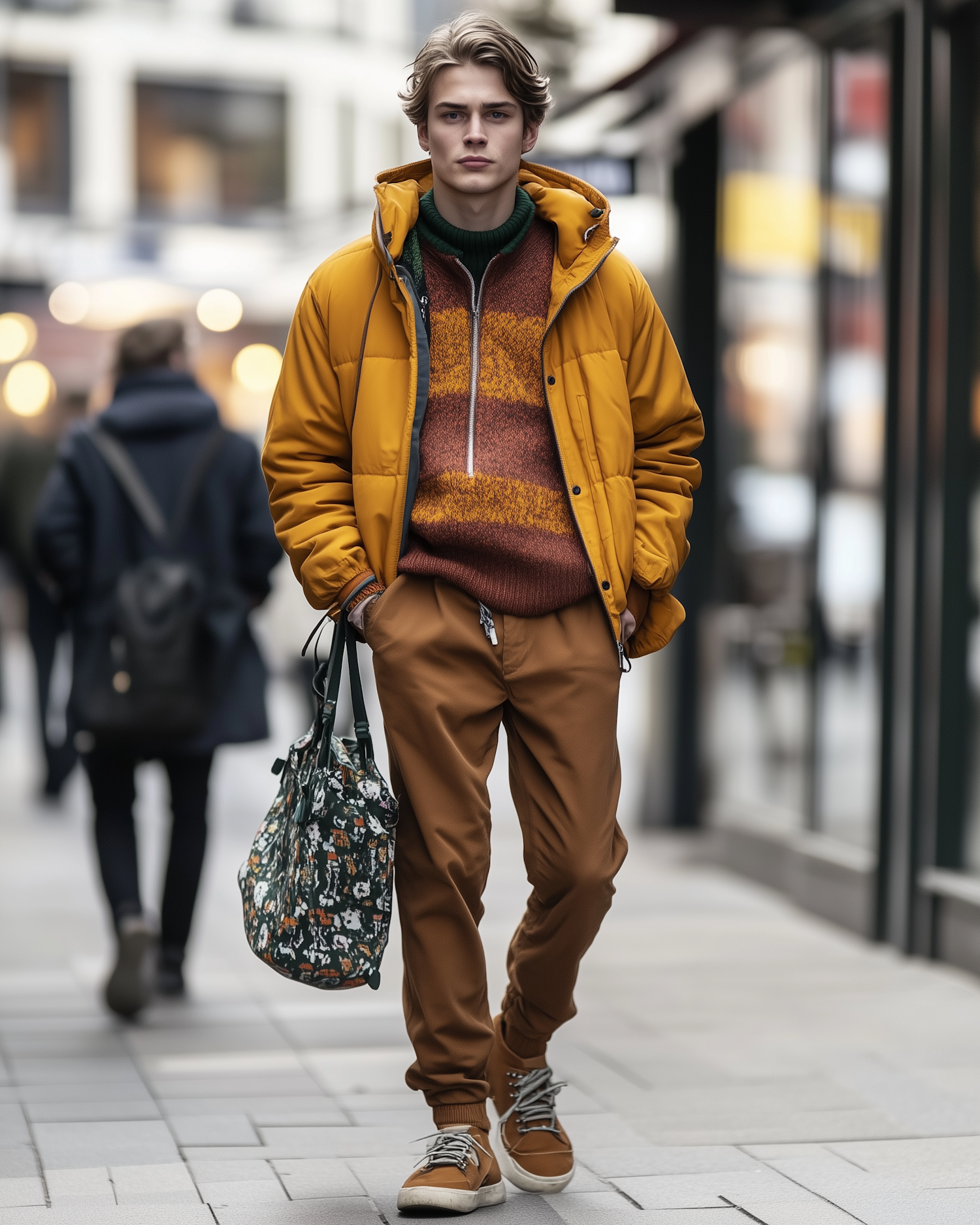 Stylish man in mustard jacket, rust sweater, and brown joggers walking in urban street with floral tote bag and tan sneakers.