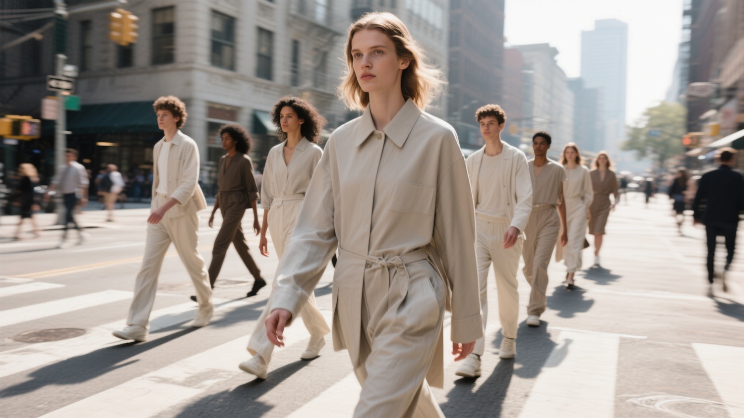 A stylish group walks through a city street in coordinated neutral outfits, showcasing modern minimalist fashion in an urban setting.