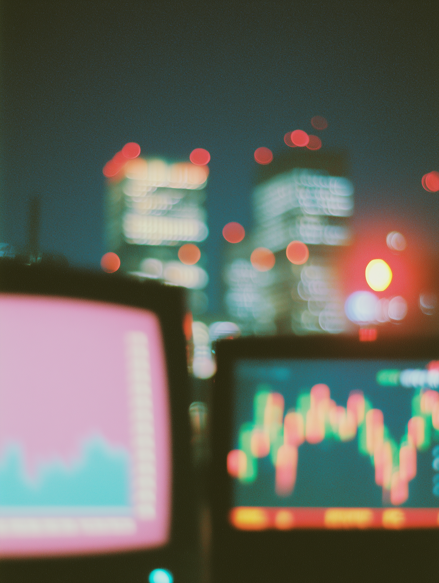 Blurred city lights at night with financial charts on screens in the foreground, creating a modern and dynamic urban finance vibe.