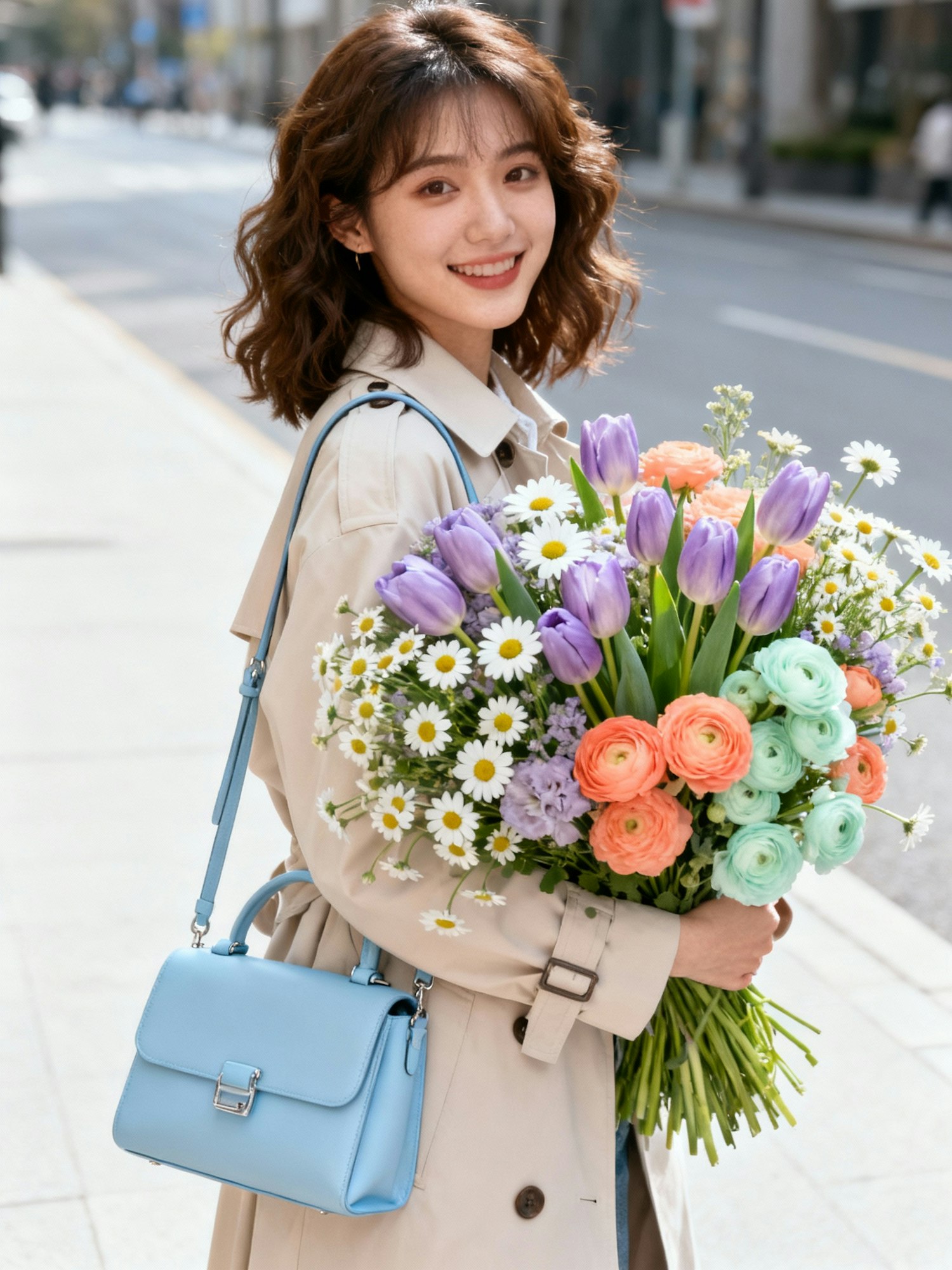 Vibrant floral photography aesthetic, studio lighting or natural daylight, clean background, highly detailed, editorial yet approachable, fresh flowers arranged with confidence, aesthetic composition, Instagram-worthy, modern and chic mood. a young woman with medium-length wavy brown hair, wearing a light beige trench coat and pastel blue handbag, holding a large mixed bouquet of tulips, daisies, ranunculus and chamomile in lavender, coral and mint tones, flowers naturally blended and overflowing, candid urban street background, playful and chic atmosphere