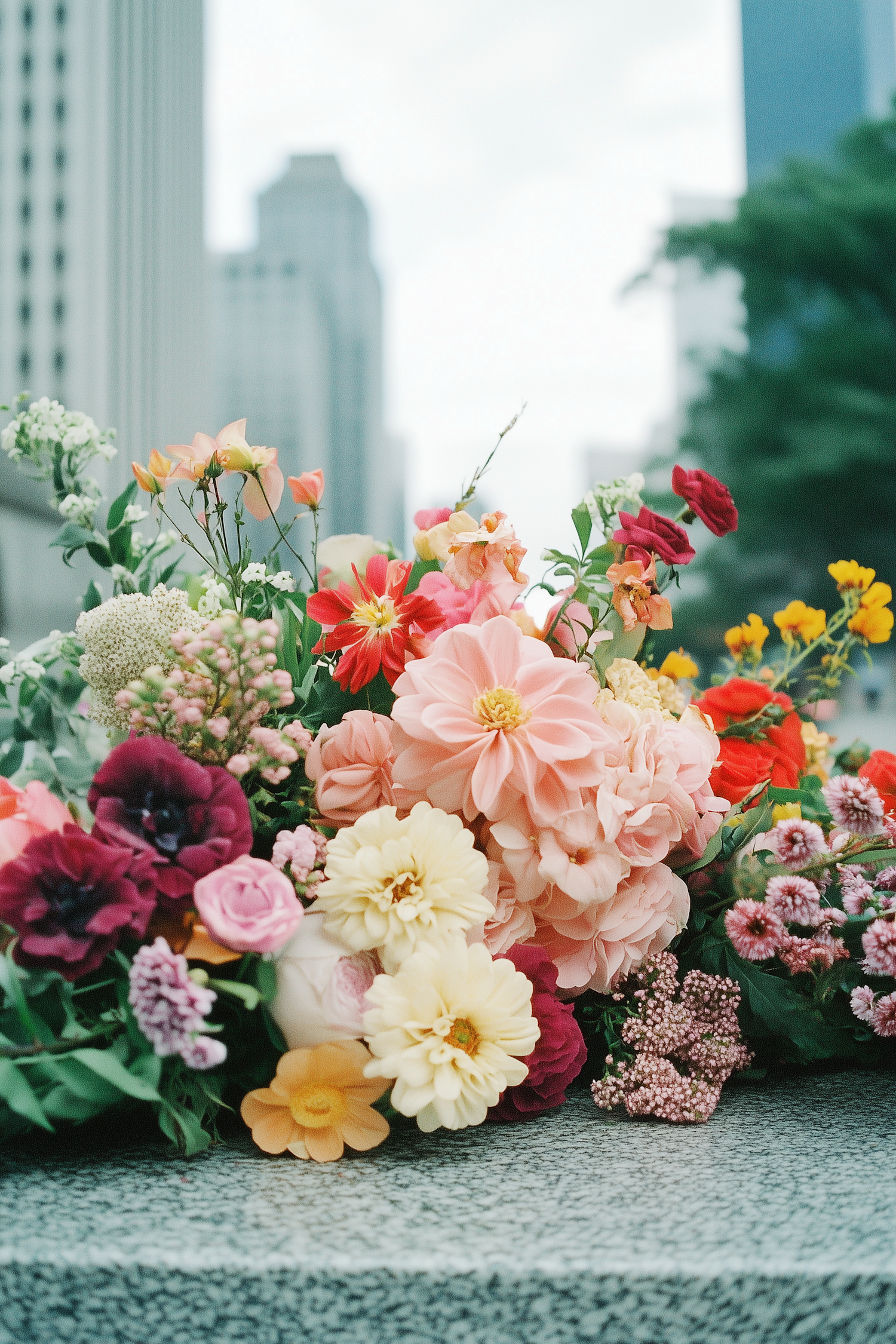 A vibrant bouquet of colorful flowers against a blurred urban backdrop, featuring pink dahlias and red roses.