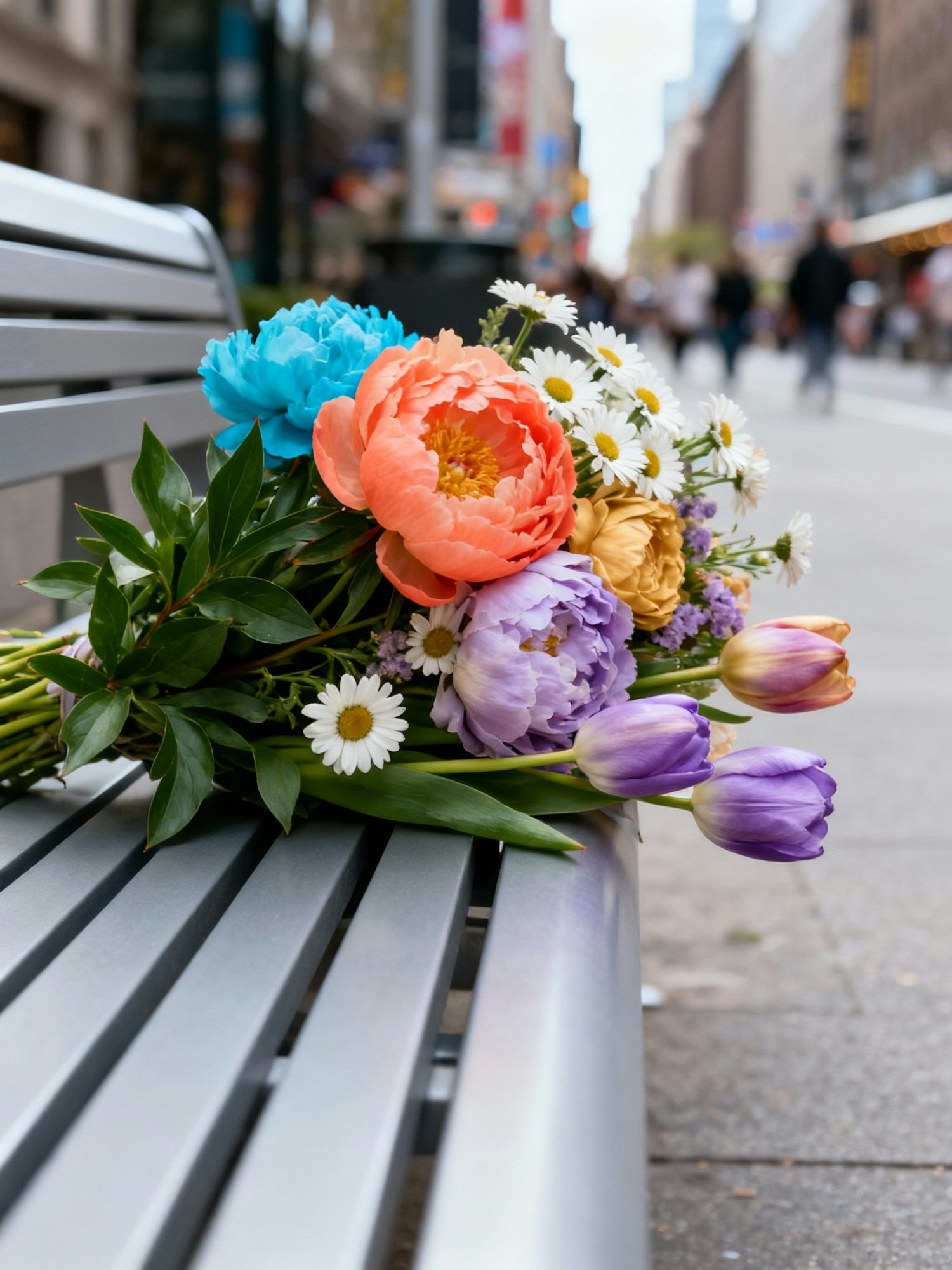 Vibrant bold aesthetic photograph, natural lifestyle style, soft daylight, candid framing, rich textures, colorful flower bouquets, not staged, influencer style photography, high quality realistic details — A colorful bouquet resting on a city bench, mix of peonies, daisies and tulips in tones of ocean sapphire, coral, honey and lavender mist, modern urban vibe, candid influencer style shot