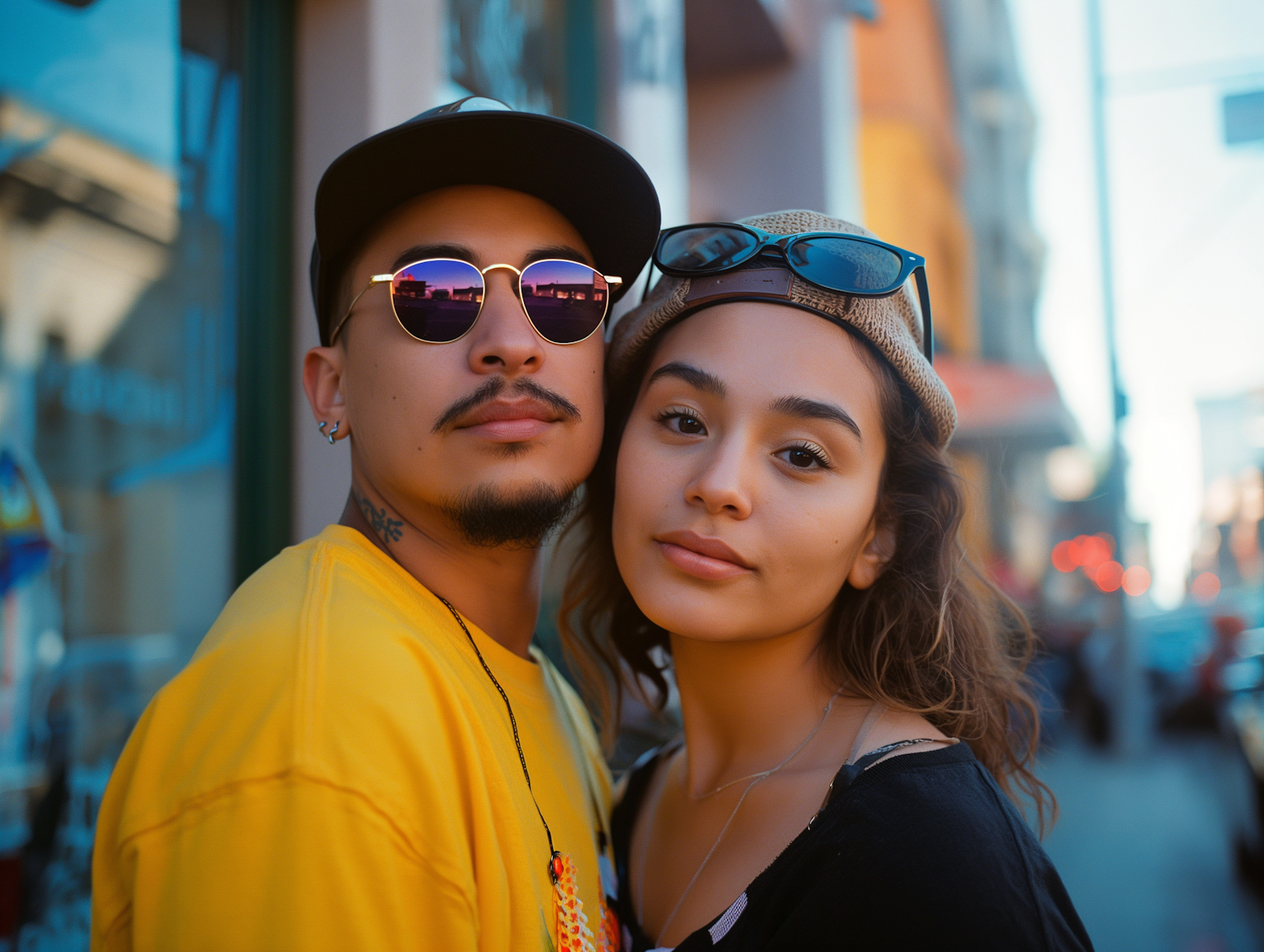 A couple in a vibrant city street, wearing casual attire with blurred faces, creating a sense of anonymity and urban life.