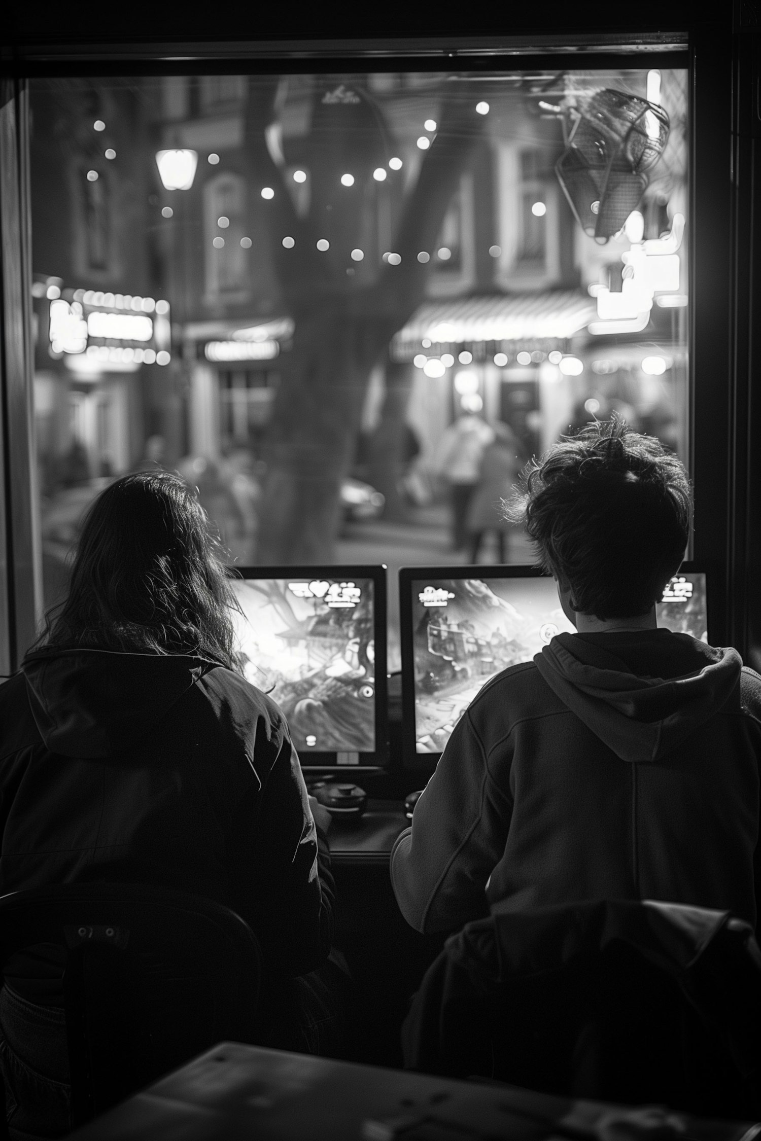 Two people gaming in a cafe, focused on screens, with a blurred street view outside. Black and white photo captures a timeless moment.