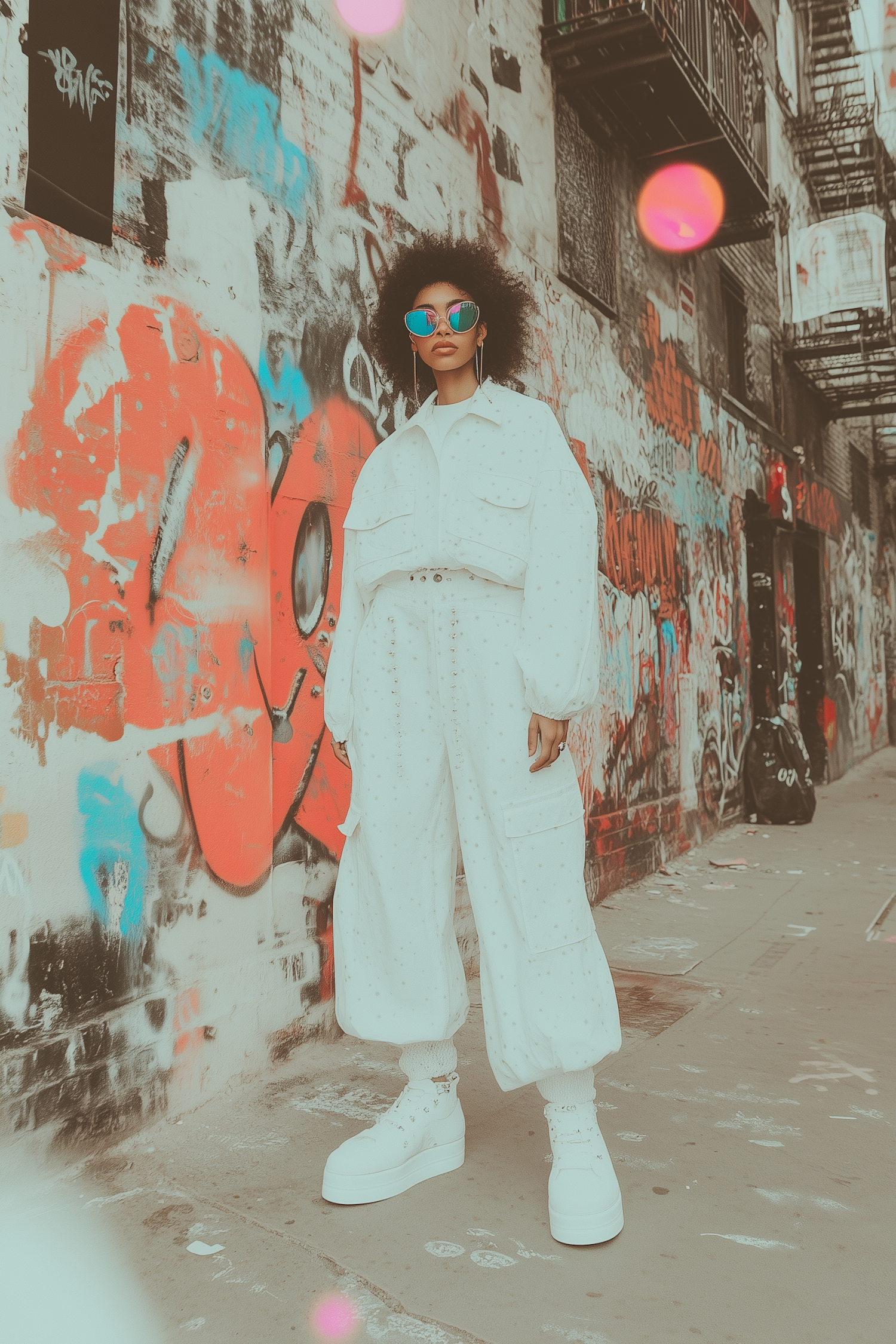 Stylish woman in a white outfit and colorful sunglasses poses in a graffiti-filled urban alleyway, blending edgy fashion with street art.