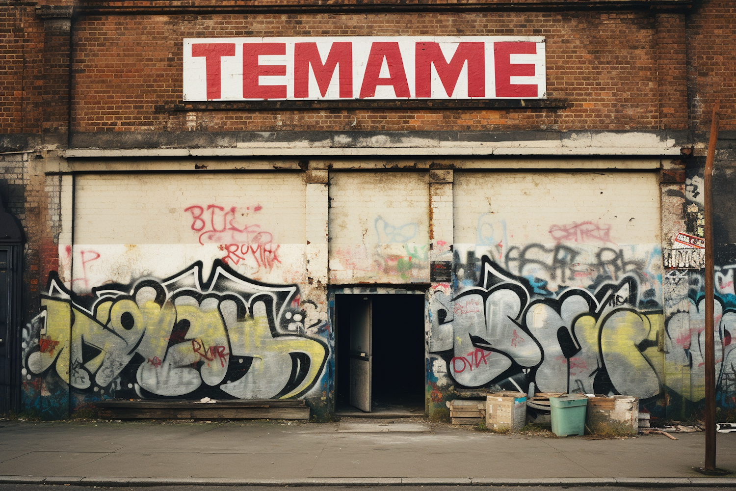 Urban brick building with 'TEMAME' sign and vibrant graffiti art. Aged facade with open door adds mystery to the gritty street scene.