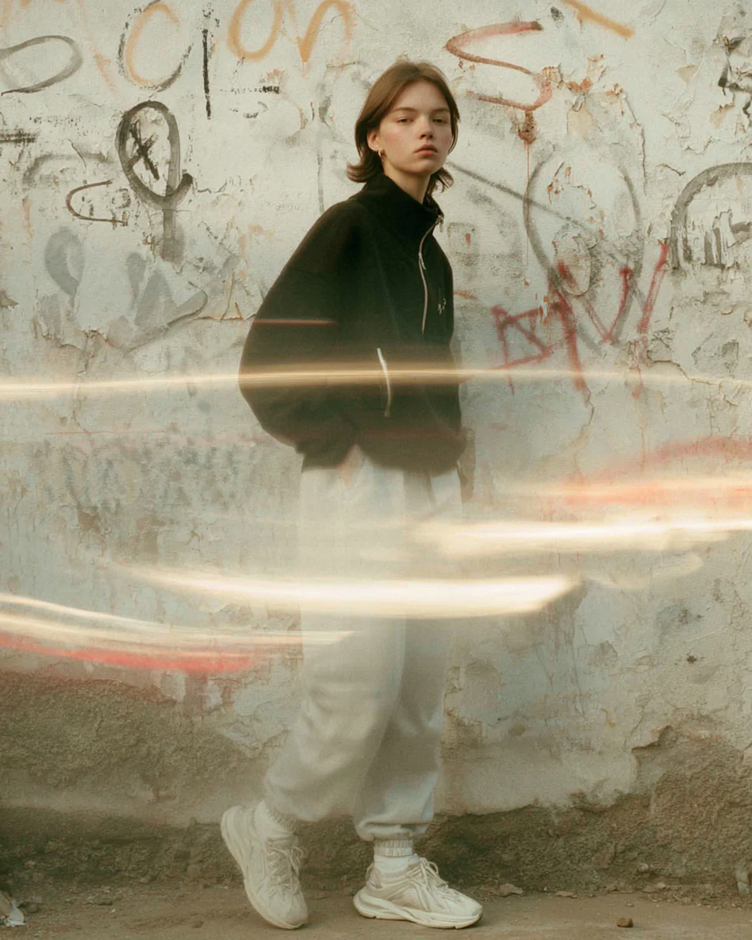 A person in casual attire stands against a graffiti-covered wall, with dynamic light streaks adding motion to the urban scene.
