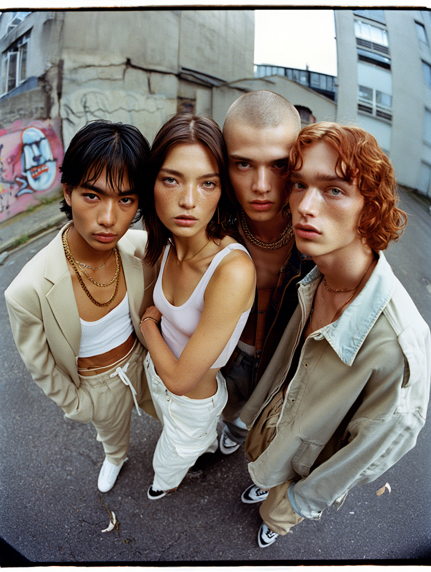 A group of four stylish young adults in neutral outfits pose in an urban setting with graffiti, exuding a modern and edgy vibe.