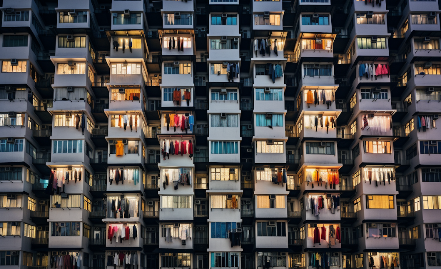 Densely packed apartment building with colorful clothes hanging on balconies, creating a vibrant urban scene.
