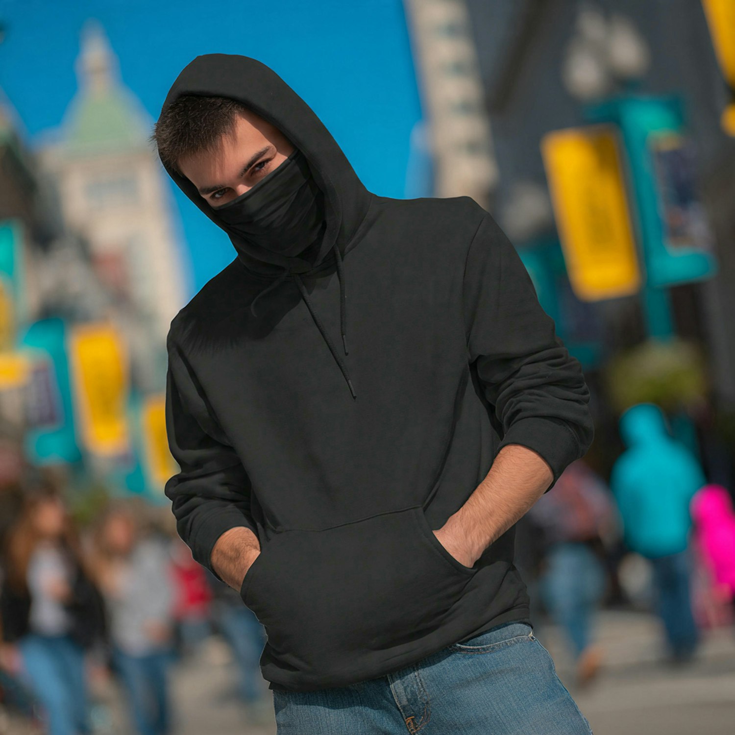 A person in a black hoodie and face covering stands in a busy city street, with colorful banners and people in the background.