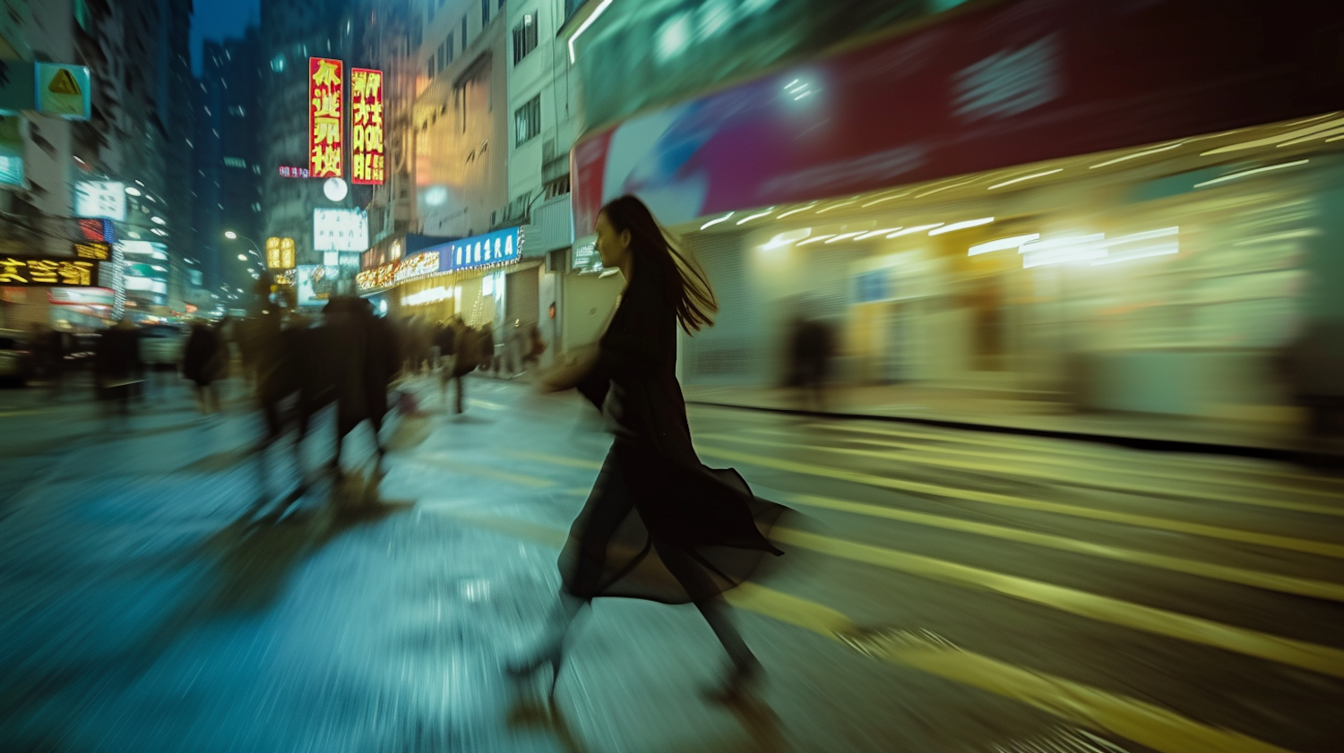 Dynamic night street scene with blurred motion, neon lights, and a woman walking briskly in a bustling urban environment.